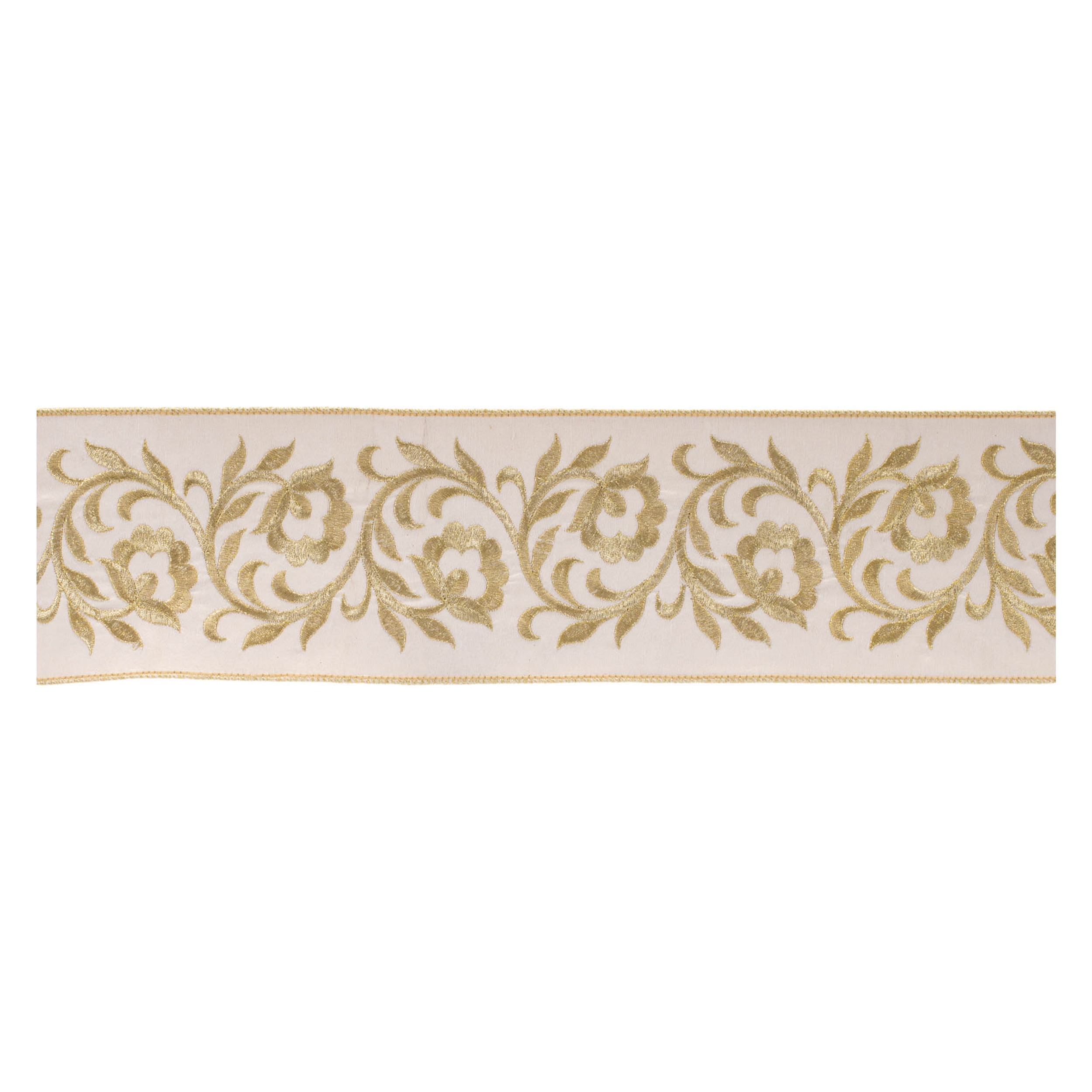 Add a sophisticated touch to your holiday decor with this ornate embroidered leaves wired ribbon. Featuring a wintry white tone with chic gold trim and intricate embroidery, this ribbon showcases an elegant leaf and floral pattern perfect for the season. Measuring 4″ wide and 5 yards long, it’s wired for easy shaping and sturdy displays. Ideal for holiday arrangements, gift wrapping, and crafts, this ribbon elevates any project with its refined, seasonal charm.