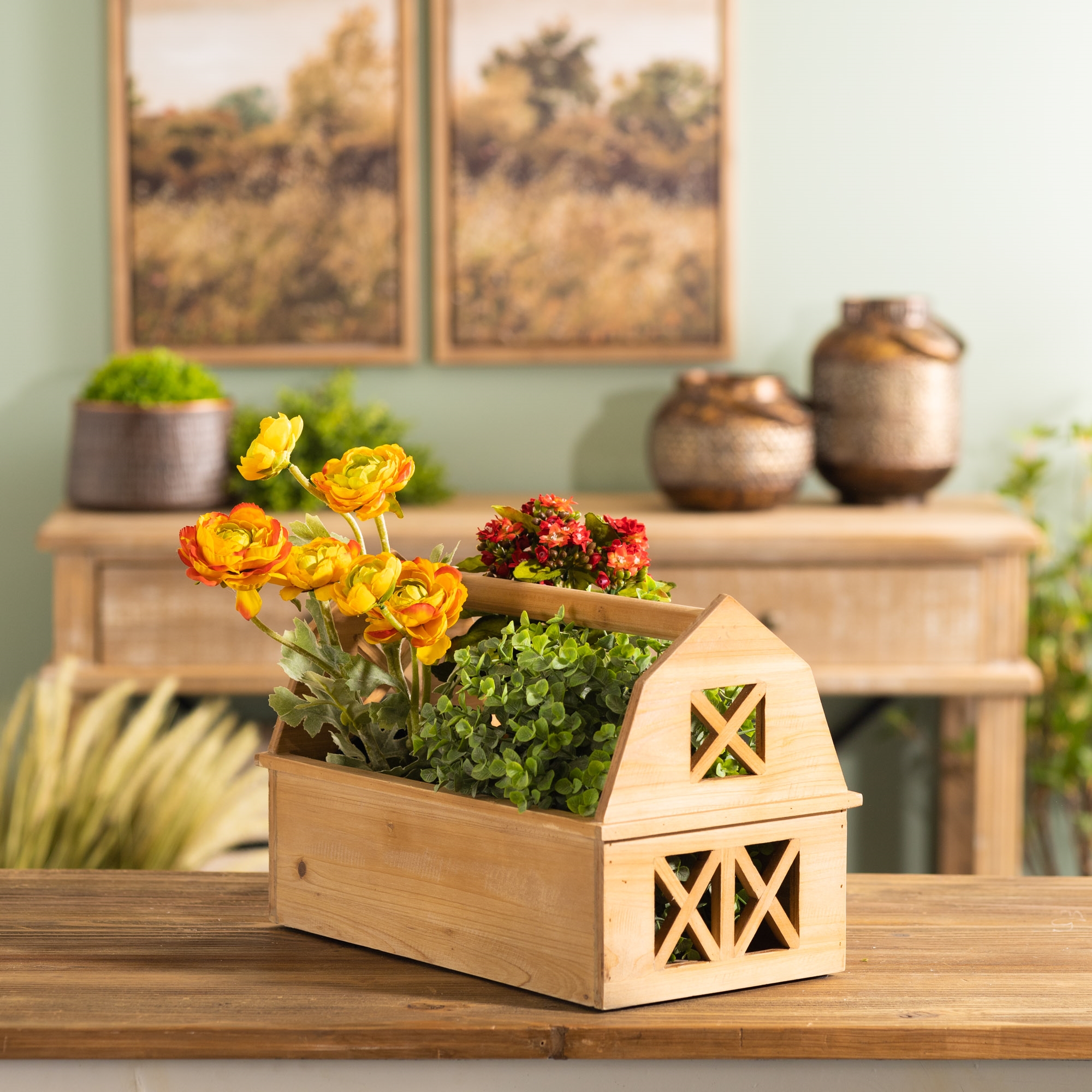 Bring charming rustic vibes into your home with this Wood Barn Caddy Tray. With its cut-out barn silhouette and natural wood finish, this 15″ decorative trug adds cozy countryside character to your space. Crafted from durable fir wood and MDF, it’s the perfect functional accent for your kitchen, dining room, or entryway. Whether you’re organizing napkins and condiments or creating a floral centerpiece, this versatile tray makes a stylish statement.