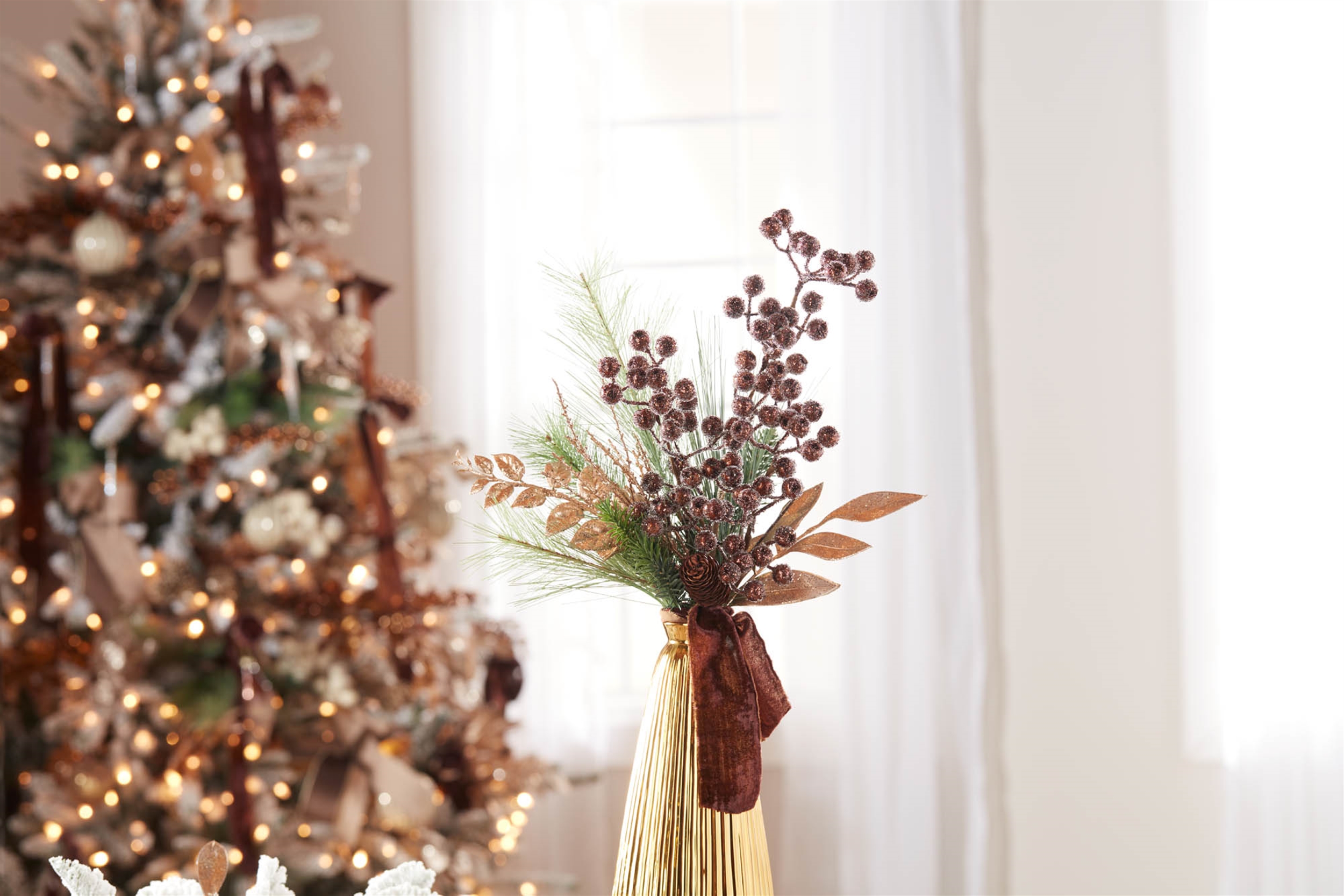 Elegant Holiday Design – Bronze berries with glitter and beaded accents create a sophisticated, festive look.