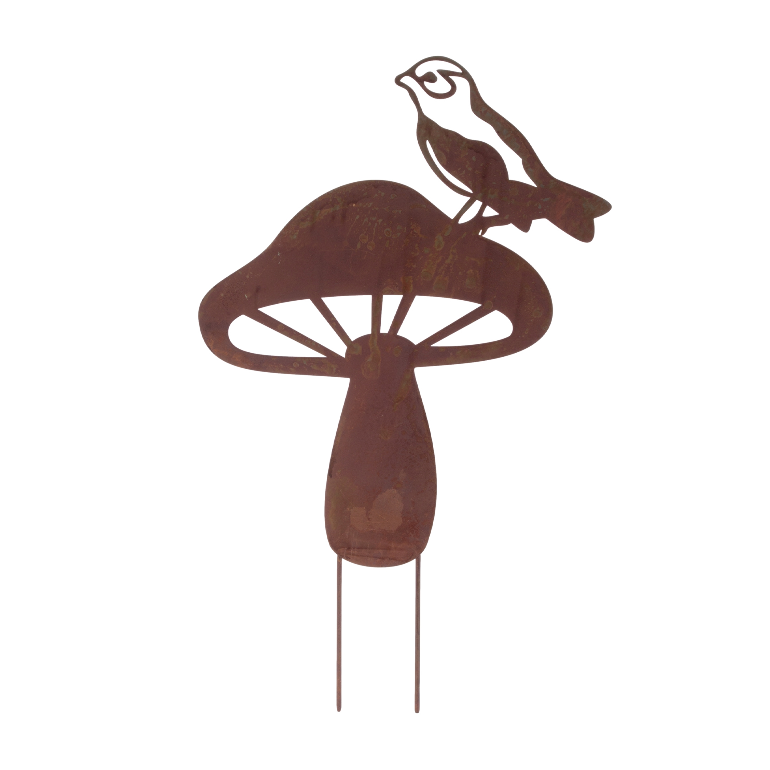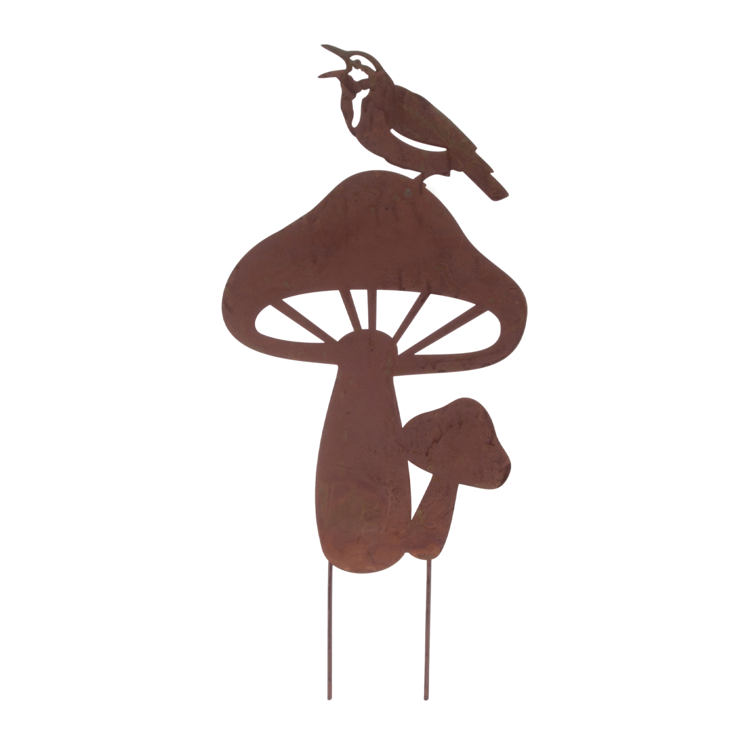 Add a touch of woodland whimsy to your outdoor decor with this Set of Metal Bird and Mushroom Garden Stakes. Featuring two assorted designs, each piece showcases a charming mushroom silhouette with artistic cut-out details and a delicate bird perched on top. The rustic bronze tones and distressed finish give this set of two stakes a warm, vintage feel—perfect for flower beds, potted arrangements, or garden pathways.