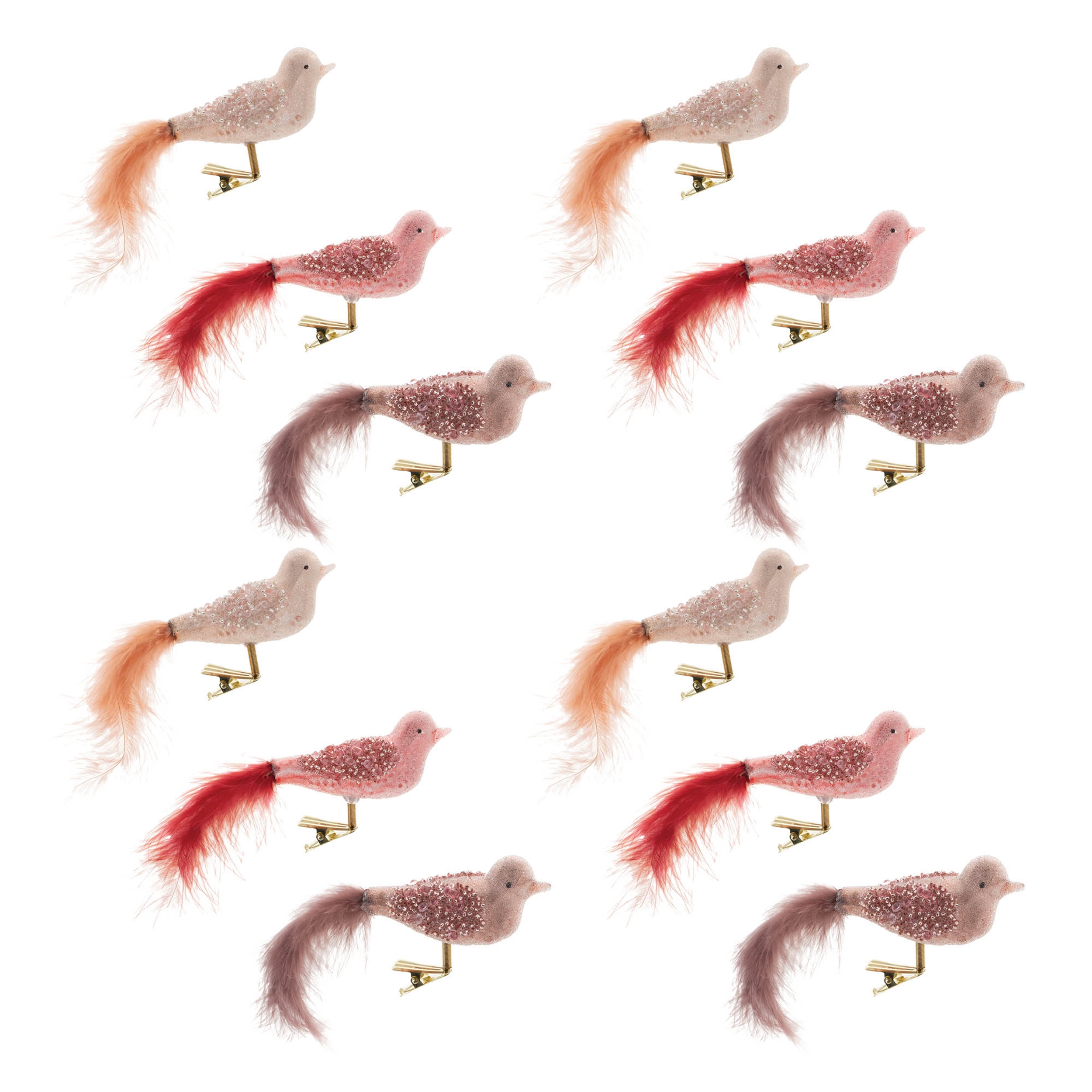 Add a touch of elegance to your holiday decor with the Beaded Glass Bird Clip Ornament. Featuring soft pink and mauve tones, these modern bird designs are enhanced with chic beaded and feathered accents, creating a stunning visual appeal. The gold clip ensures a sturdy display, making these ornaments perfect for adding a glamorous, festive touch to your Christmas tree, front door wreath, or mantle garland. Sold in a set of 12 pieces with three assorted designs, these ornaments will elevate your seasonal display with a blend of style and charm.