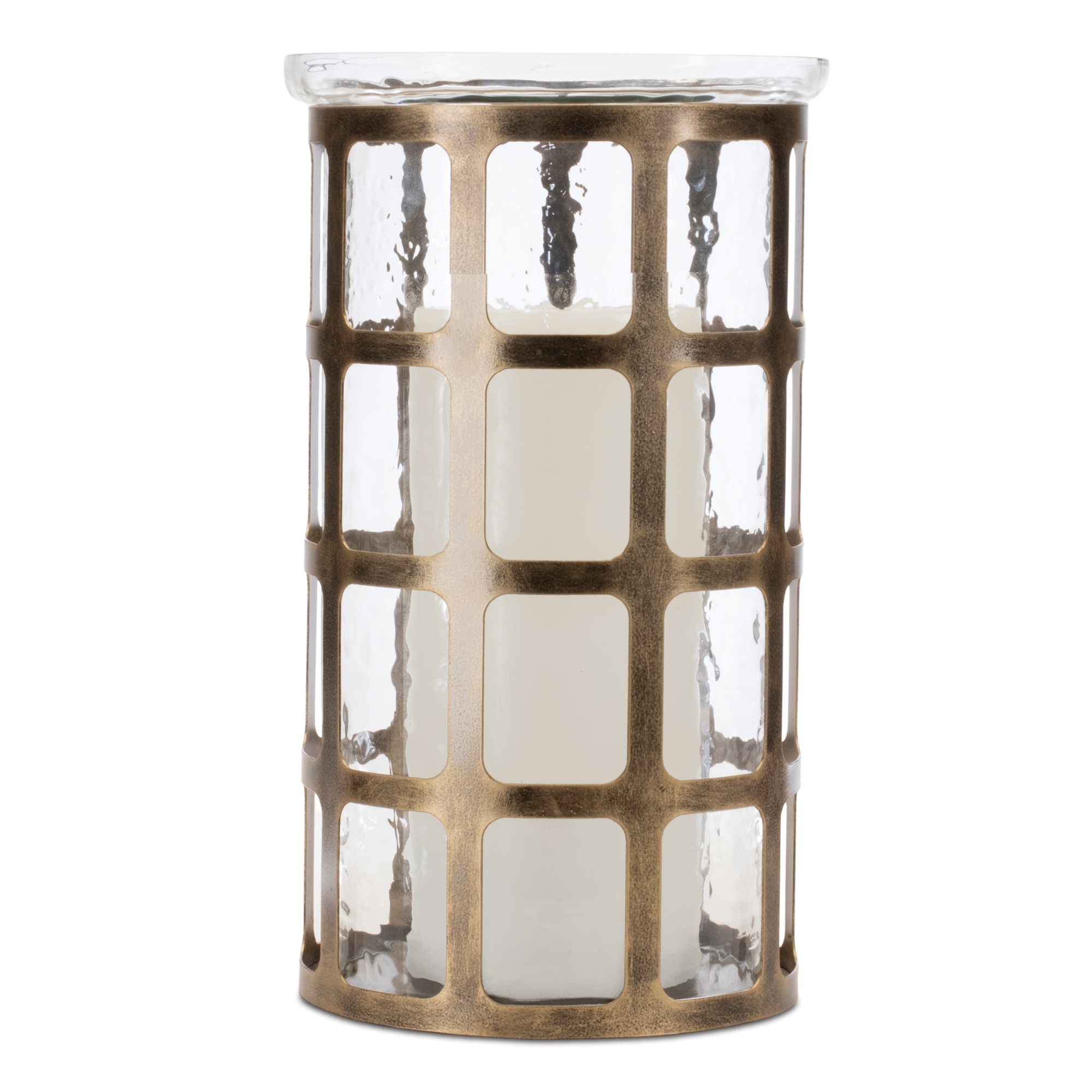 Add an elegant glow to your space with the Wavy Glass Hurricane Candle Holder. Featuring a unique abstract wavy glass design and a distressed gold metal frame, this candle holder brings a chic, modern touch to any room. Crafted from high-quality iron and glass, it’s built to last through the seasons. Perfect for tabletops, mantels, or as a centerpiece, simply add a 4†or 5†pillar candle (sold separately) for a warm and inviting ambiance.