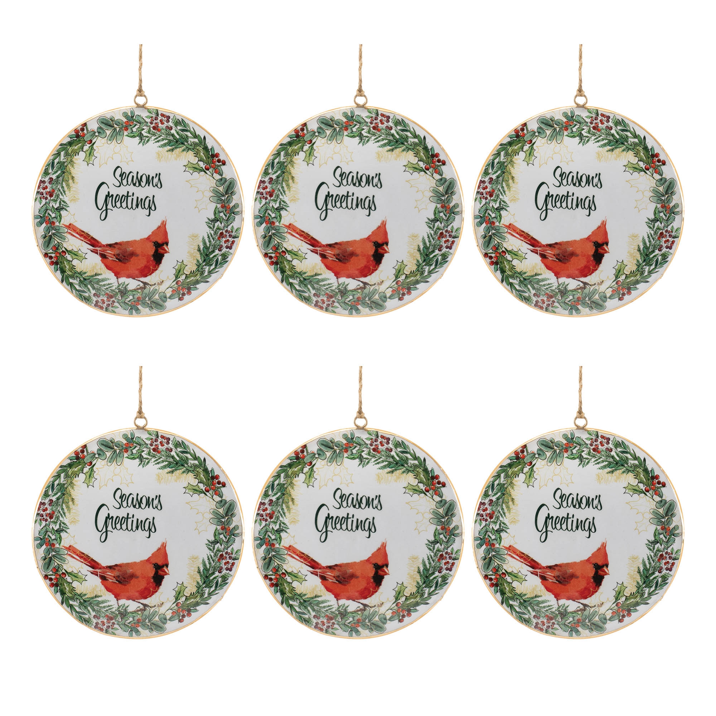 Celebrate the season with these beautifully crafted Seasons Greetings Cardinal Disc Ornaments. Each ornament features elegant watercolor artwork showcasing a beloved cardinal bird nestled in a winter foliage wreath, with the festive sentiment “Seasons Greetings.” The red and green tones bring a cozy, woodland charm to your tree or holiday decor. With a delicate jute string hanger, these ornaments are easy to display, and with a set of 6 matching pieces, they make the perfect gift to share the beauty of the season with loved ones.
