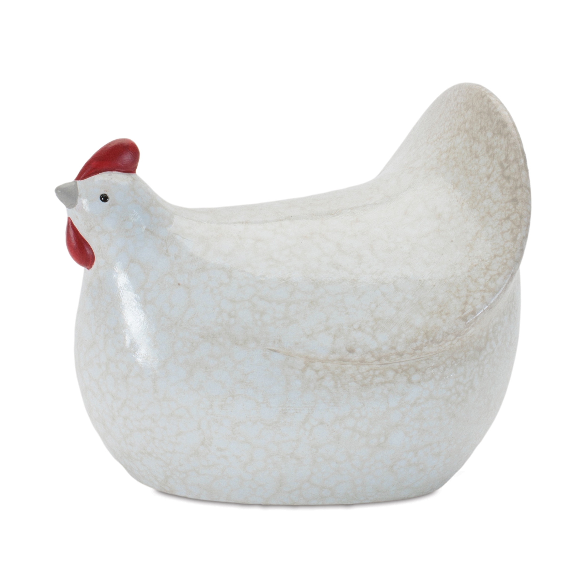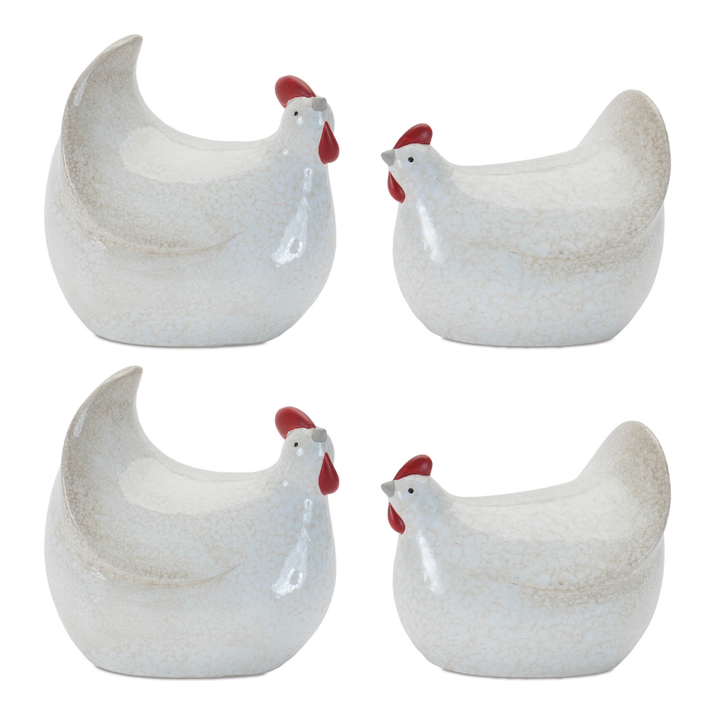 Add rustic charm with a modern twist to your home decor with this set of four Terra Cotta Chicken accents. Crafted in cool white and beige tones with distressed speckles and a soft glazed finish, each piece showcases a contemporary chicken silhouette perfect for farmhouse, cottagecore, or country-style interiors. With two unique designs in each set, these playful yet elegant figures are ideal for mantels, shelves, or kitchen displays.