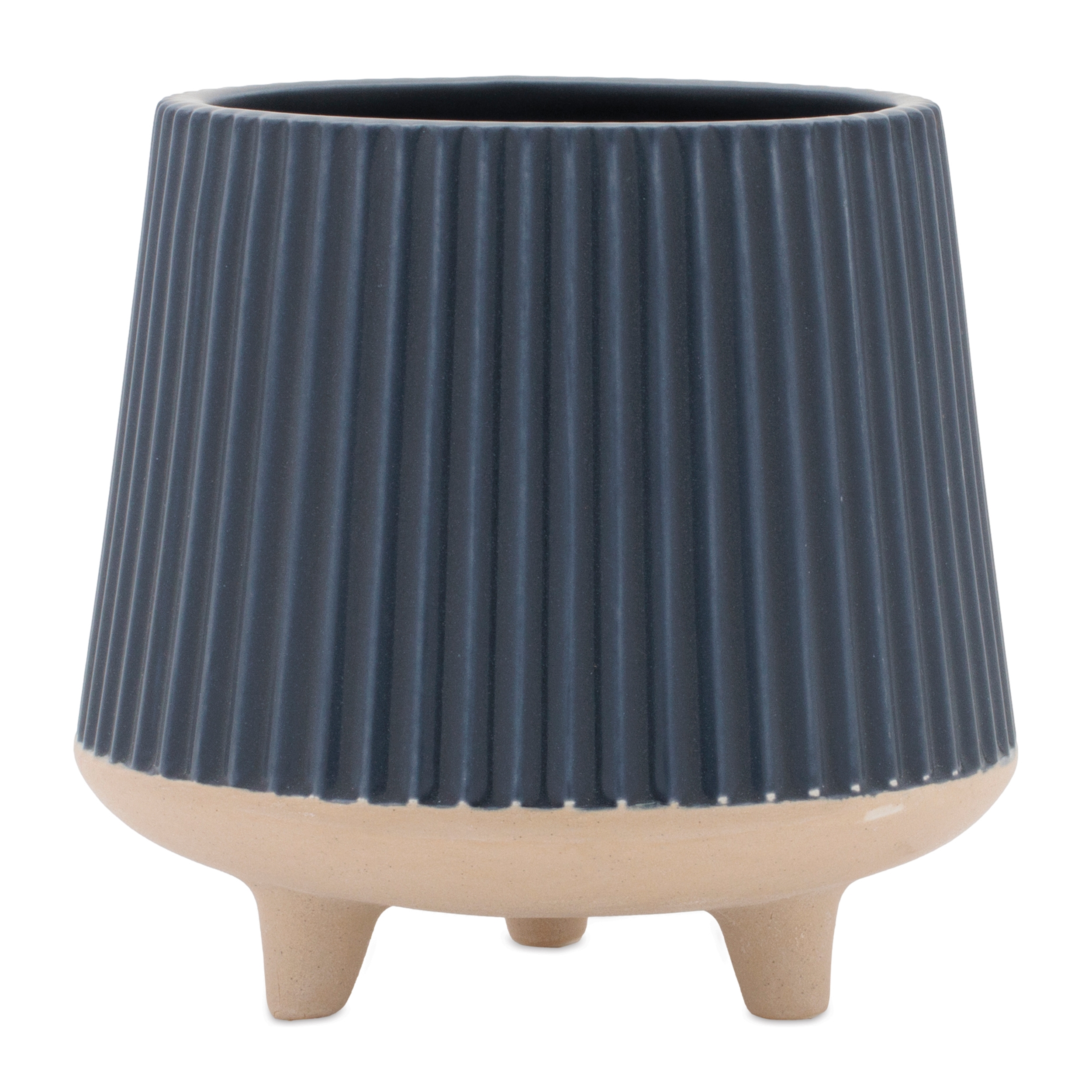 Elevate your plant display with the Ceramic Ribbed Footed Planter Set. These planters feature cool navy blue and beige tones with a combination of glazed and unglazed accents, providing a sophisticated, textured look. The ribbed texture and footed accents add a modern touch to any space. Sold as a set of two matching planters, they are perfect for showcasing both real or faux plants. Ideal for use in both indoor and outdoor covered areas, these planters offer versatility and style for any decor.