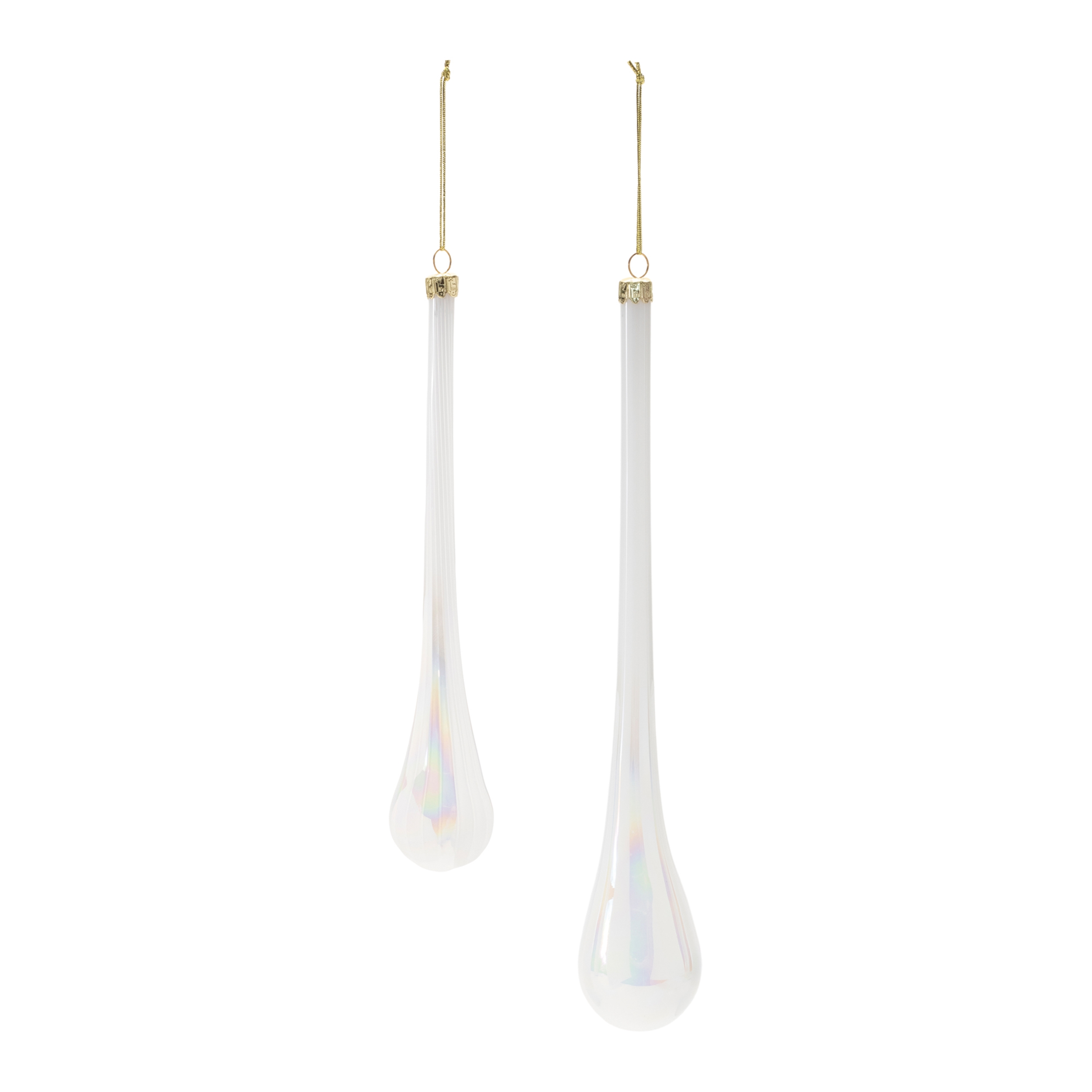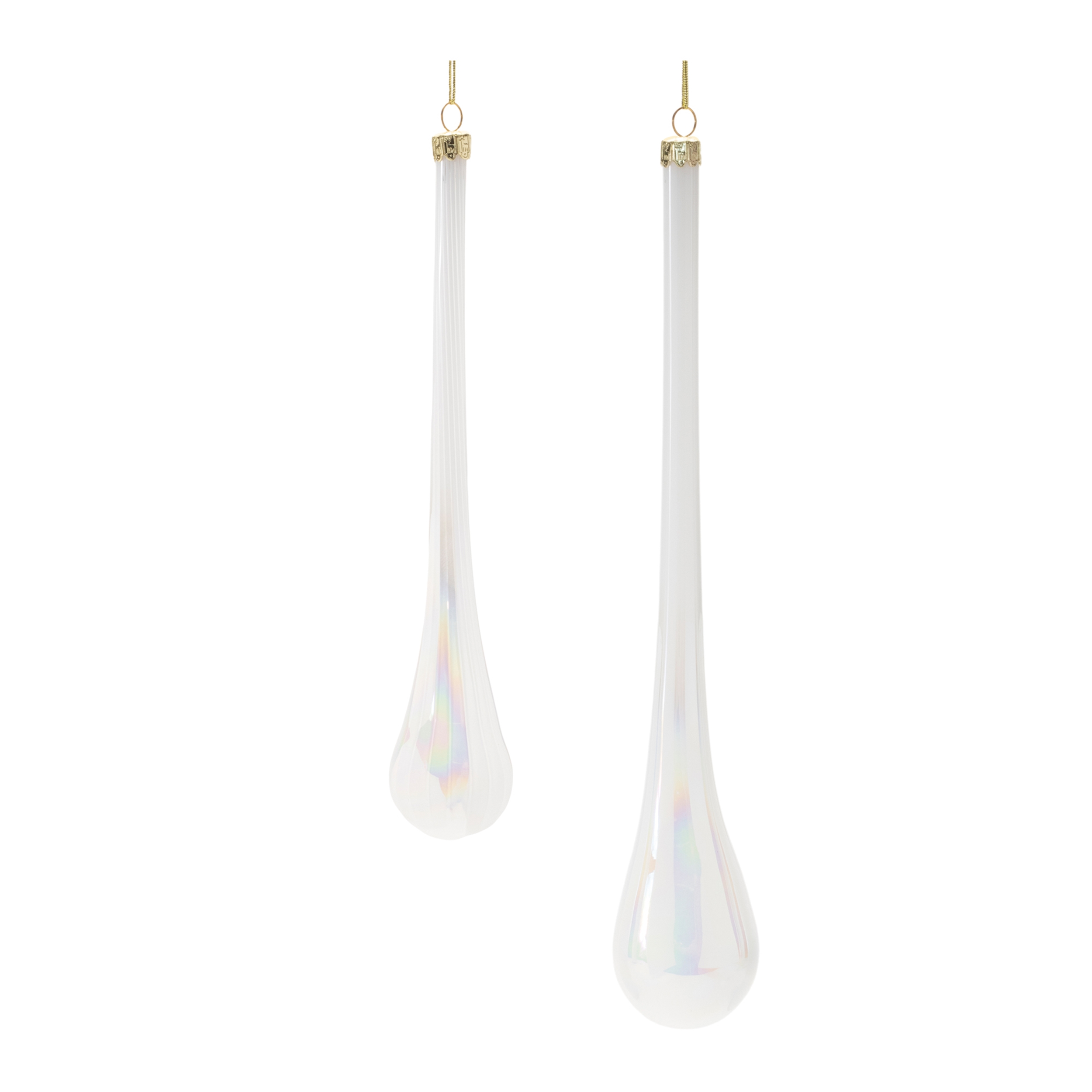 Elevate your holiday decor with the Iridescent Glass Drop Ornaments. Featuring wintry white and pearl tones with a chic iridescent finish, these ornaments boast an elegant drop shape with a ribbed glass texture. The delicate string hanger and gold ornament cap add a touch of sophistication. Sold in a set of 6 pieces, including two assorted sizes, these ornaments are perfect for adding modern holiday cheer to your Christmas tree or weaving them into wreaths and garlands for a stylish statement.