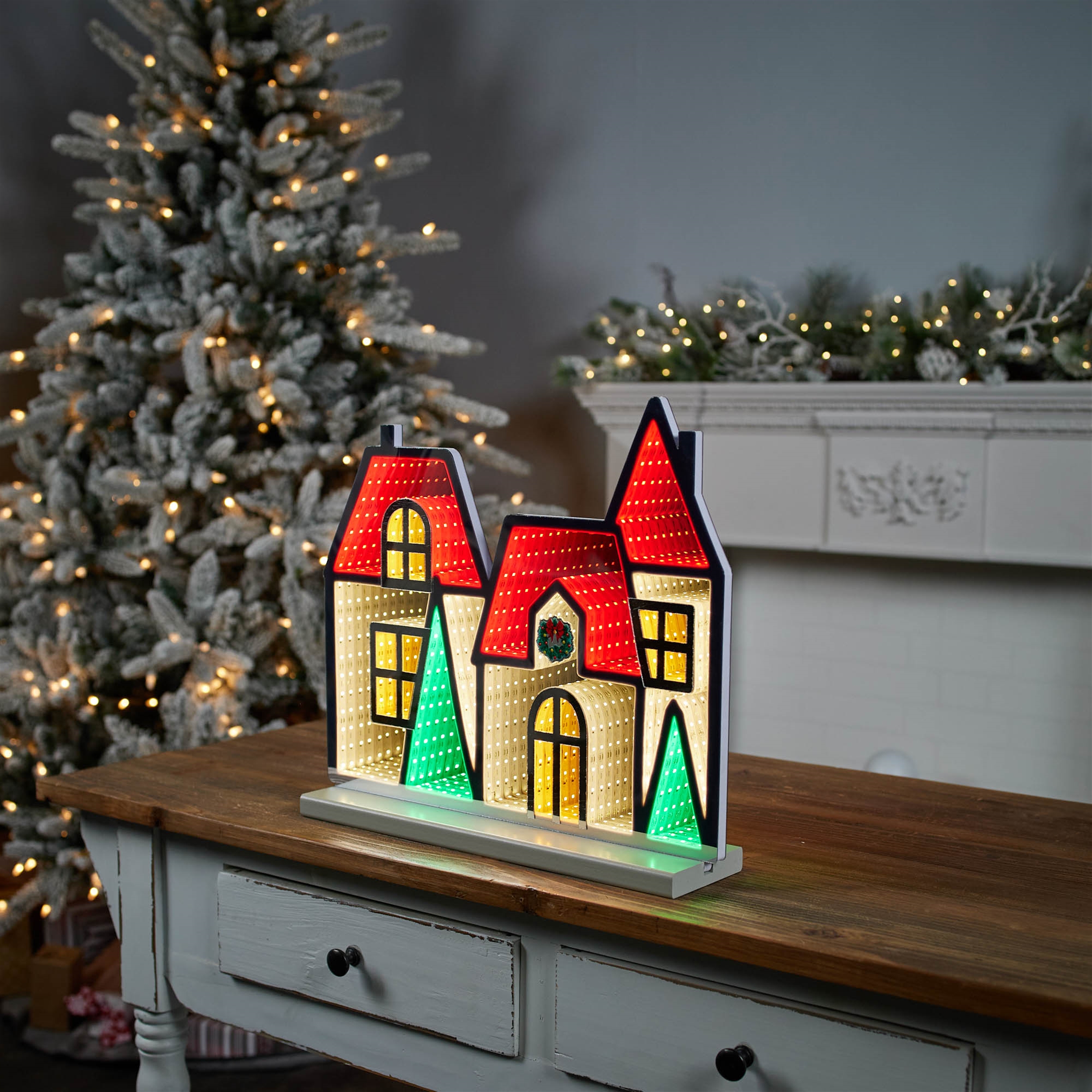 Step into a festive winter wonderland with the Winter Village Ekkolight. This charming house-shaped decoration, with its bright red and green tones, creates a nostalgic holiday vibe. Pine tree accents add a touch of nature to the scene, while the EkkoLight Infinity Lights illuminate your space in a captivating, endless glow. Perfect for any holiday setup, this Ekkolight will infuse your home with warmth and cheer.