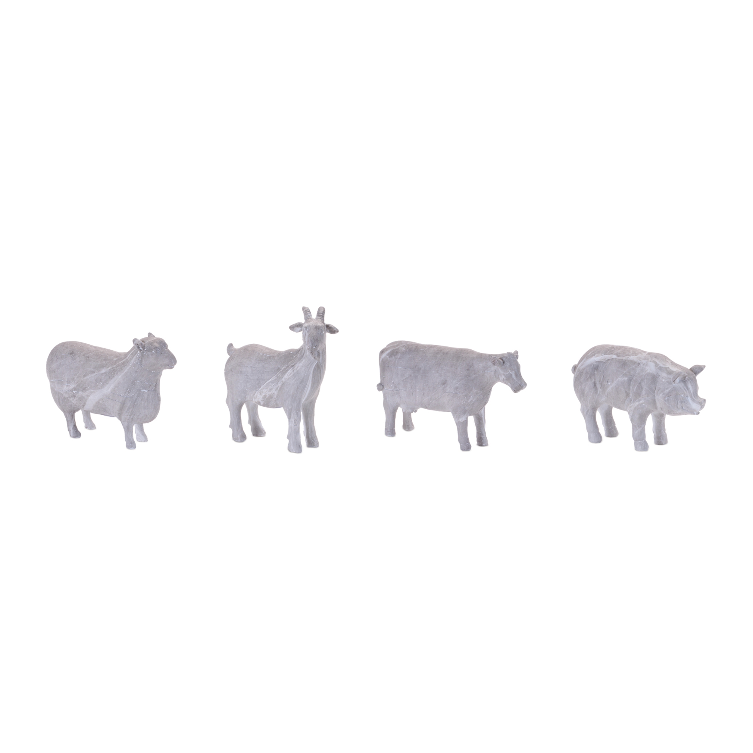 Add a rustic, nature-inspired touch to your space with the Distressed Farm Animal Figurine set. Featuring cool grey and beige tones with a rustic distressed finish, these farm animal characters are crafted with a faux stone design. This set includes four assorted animals: sheep, goat, cow, and pig, allowing you to arrange them in a variety of ways. Perfect for adding charm to bookshelves, tabletops, or farmhouse decor, these figurines are a wonderful complement to any modern farmhouse or rustic country style of interior.