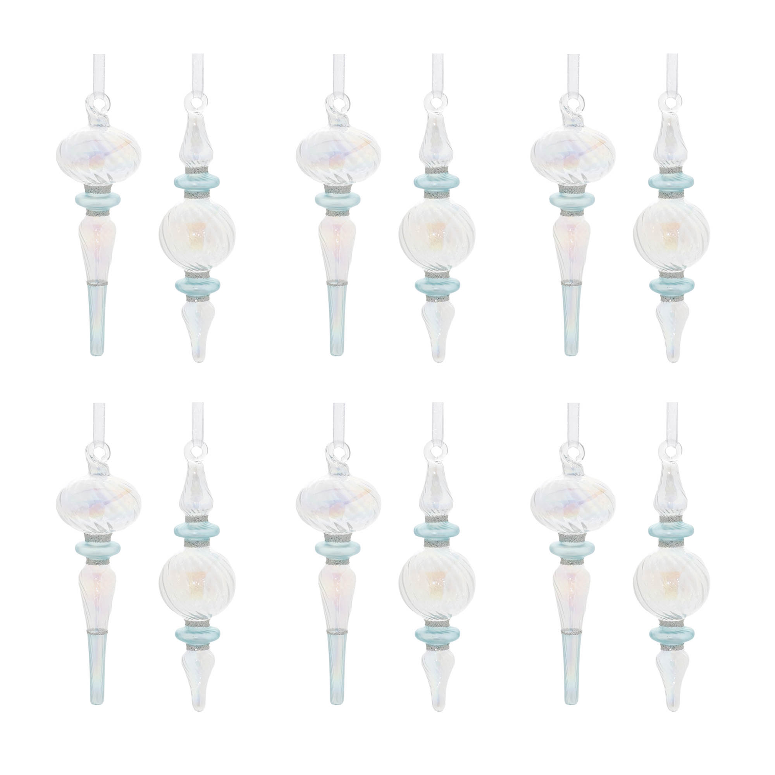 Enhance your holiday decorations with these exquisite Iridescent Finial Drop Ornaments. Featuring stunning wintry blue tones paired with a clear glass base, these ornaments shimmer with an iridescent finish that adds a festive glow to any space. Designed in a traditional finial shape with a ribbed texture, each ornament is topped with an elegant swirled glass cap and suspended from a delicate ribbon string hanger for easy display. Sold in a set of 12, with two assorted designs, these versatile ornaments can be used to adorn your Christmas tree, wreaths, or mantle garlands, elevating your seasonal decor with sophisticated, sparkling charm.
