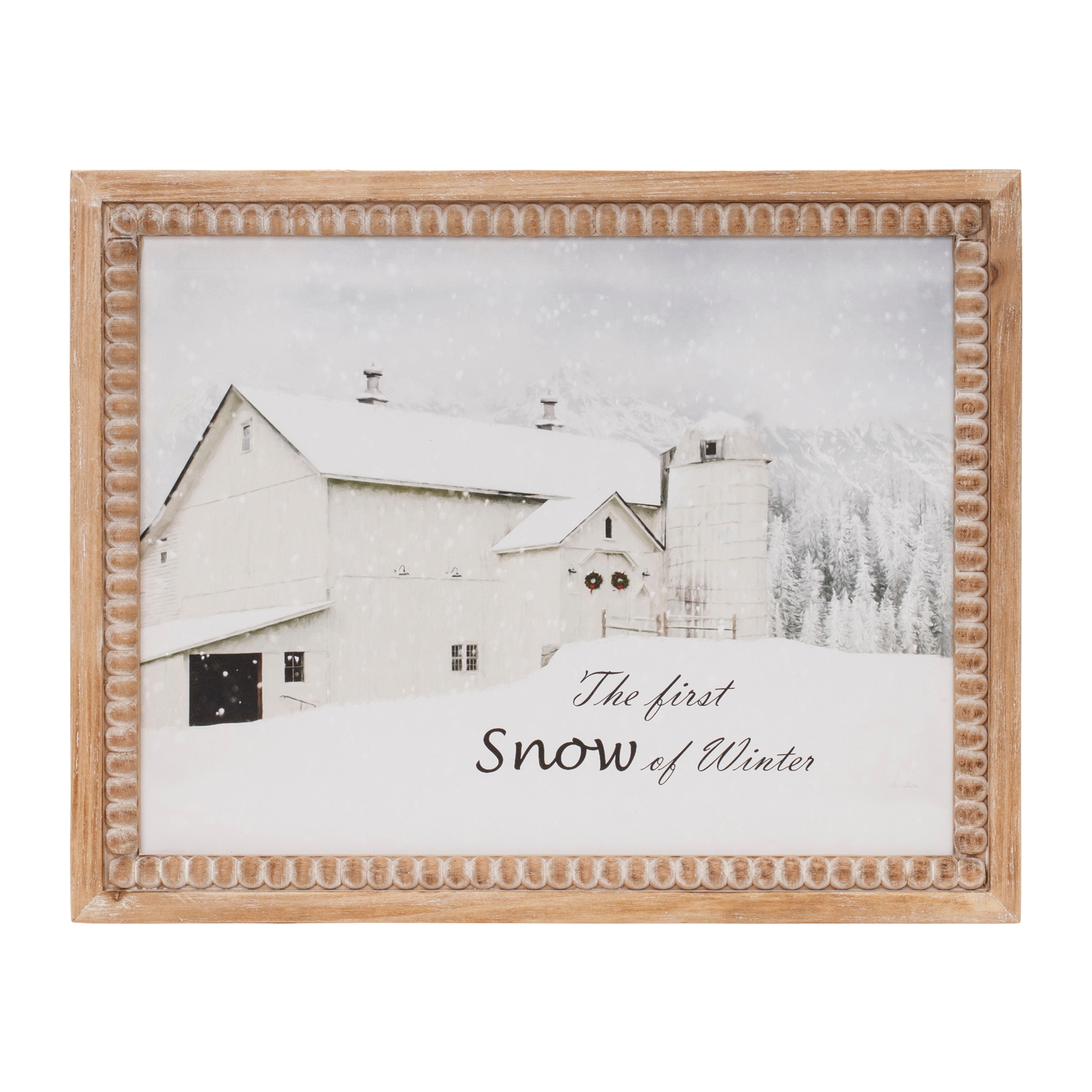 Bring the beauty of the season into your home with the Framed First Snow Barn Print. This charming piece of Christmas wall decor features a traditional winter barn scene, complemented by the heartfelt sentiment, “The First Snow of Winter.” The white and brown tones evoke a cozy, wintry vibe that will enhance any room, whether displayed in your entryway, living room, or mantle. Crafted from durable MDF with a natural beaded fir wood frame, this print is not only a seasonal favorite but a timeless addition to your holiday collection. Celebrate the magic of the season and make every moment a little more festive with this beautiful wall art!