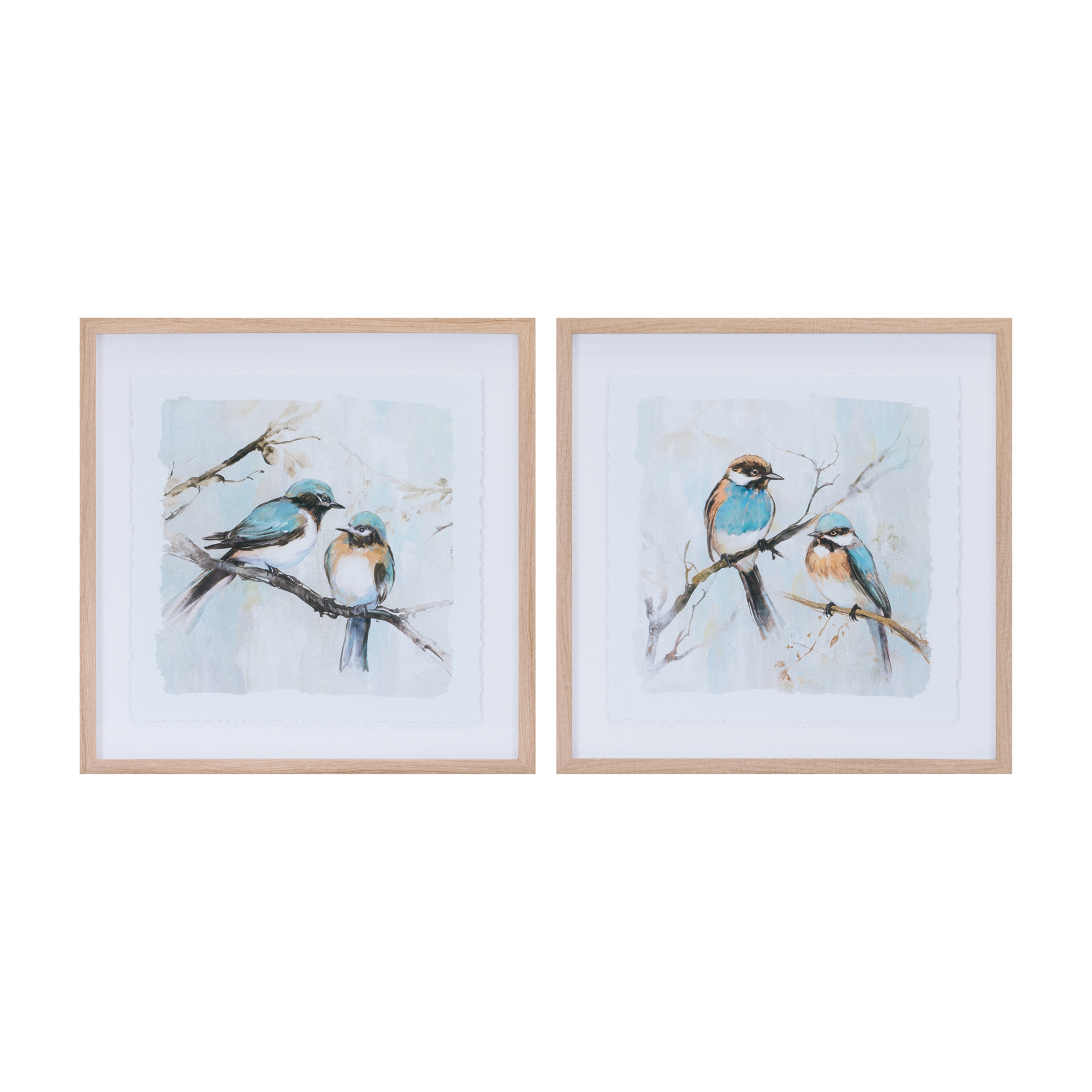 Bring a serene touch of nature into your home with this charming Framed Bird Couple Wall Print Set. Featuring beautifully painted birds perched on branches, each print is rendered in soft blue and white tones and framed with a natural wood grain look. Each piece comes with two D-ring hangers on the back for securing them safely to the walls of your home. Sold in a set of two assorted designs, these elegant prints are a peaceful and timeless addition to your living room, bedroom, or hallway.