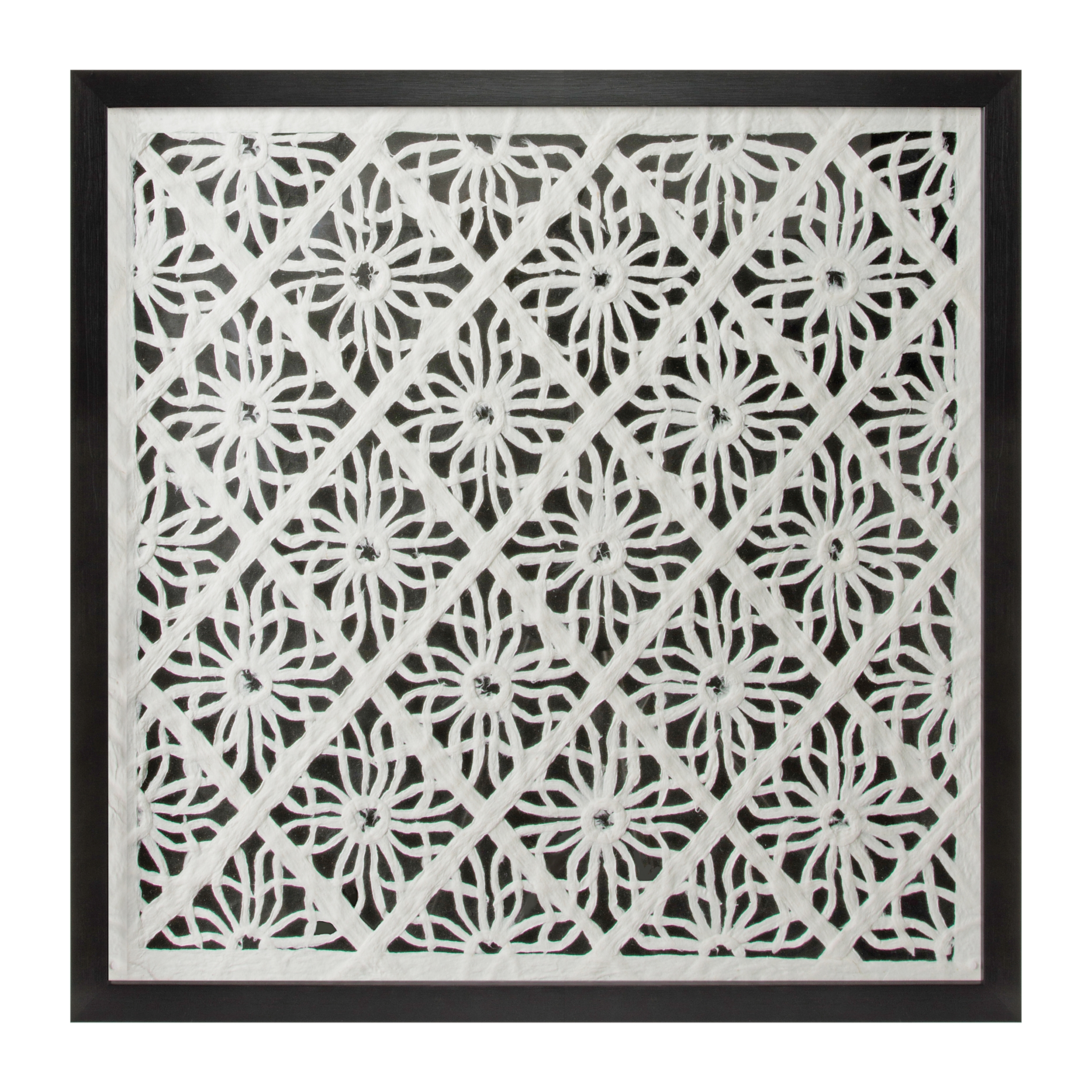 Add a contemporary and sophisticated touch to your space with this Framed Floral Wall Decor. Featuring an elegant geometric floral pattern in a paper mache composition, this piece is set within a sleek black wood frame and highlighted by a white matte outline. The delicate glass covering adds a polished finish while protecting the artwork. The piece comes with two sawtooth hooks on the back for securing it safely to the wall of your home. Perfect for modern or minimalist interiors, this striking piece brings bold yet refined style to any room.