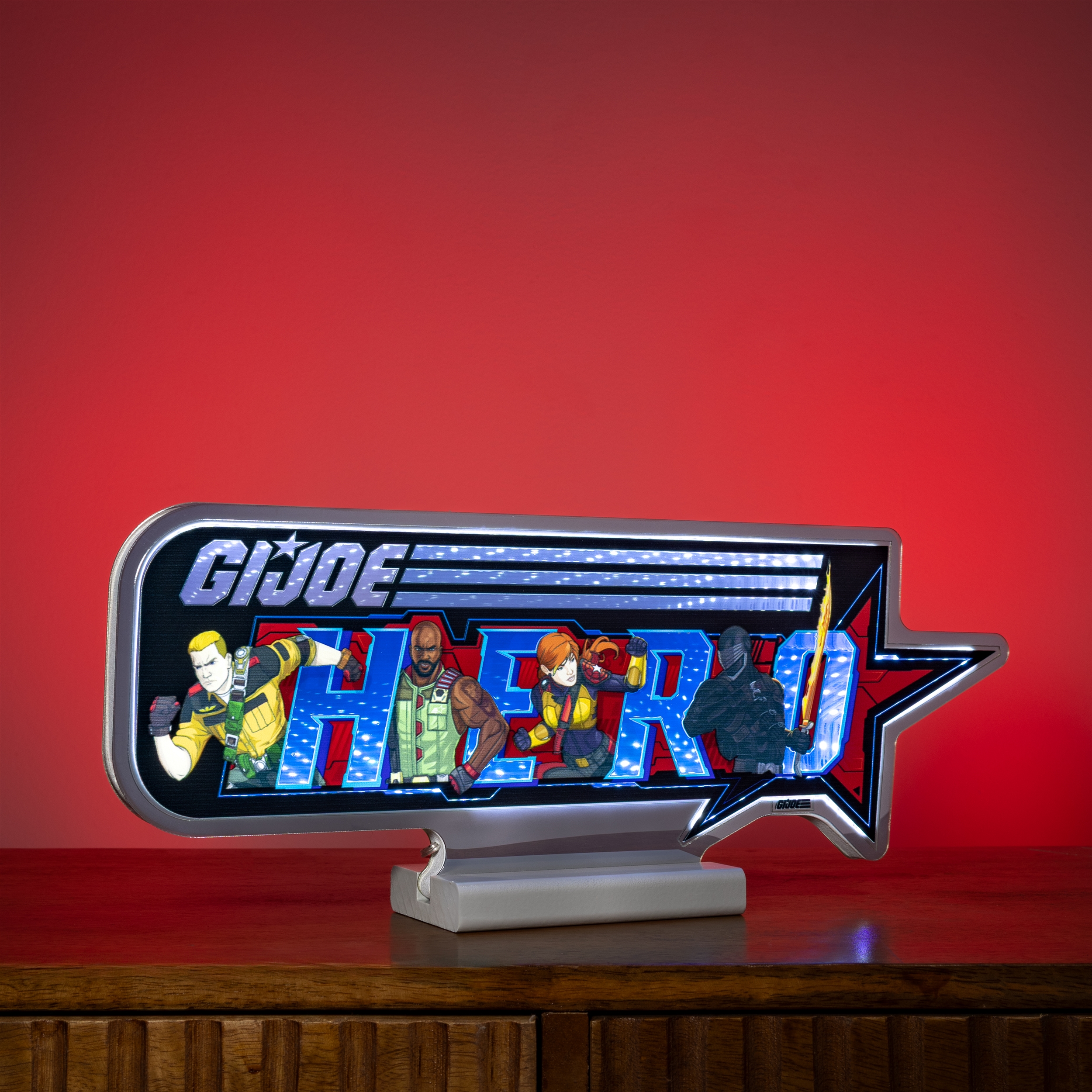 Bring home the bold spirit of America’s elite heroes with the G.I. Joe Hero Ekkolight. This dynamic infinity-LED tabletop accent shines with vivid blue and red illumination, creating a captivating depth effect that fans of the iconic franchise will instantly recognize. Designed to celebrate the courage, action, and adventure that define G.I. Joe, this striking décor piece transforms any room into a tribute to heroism. Whether displayed in a game room, office, or collector’s shelf, it’s the perfect blend of fandom pride and futuristic visual appeal.