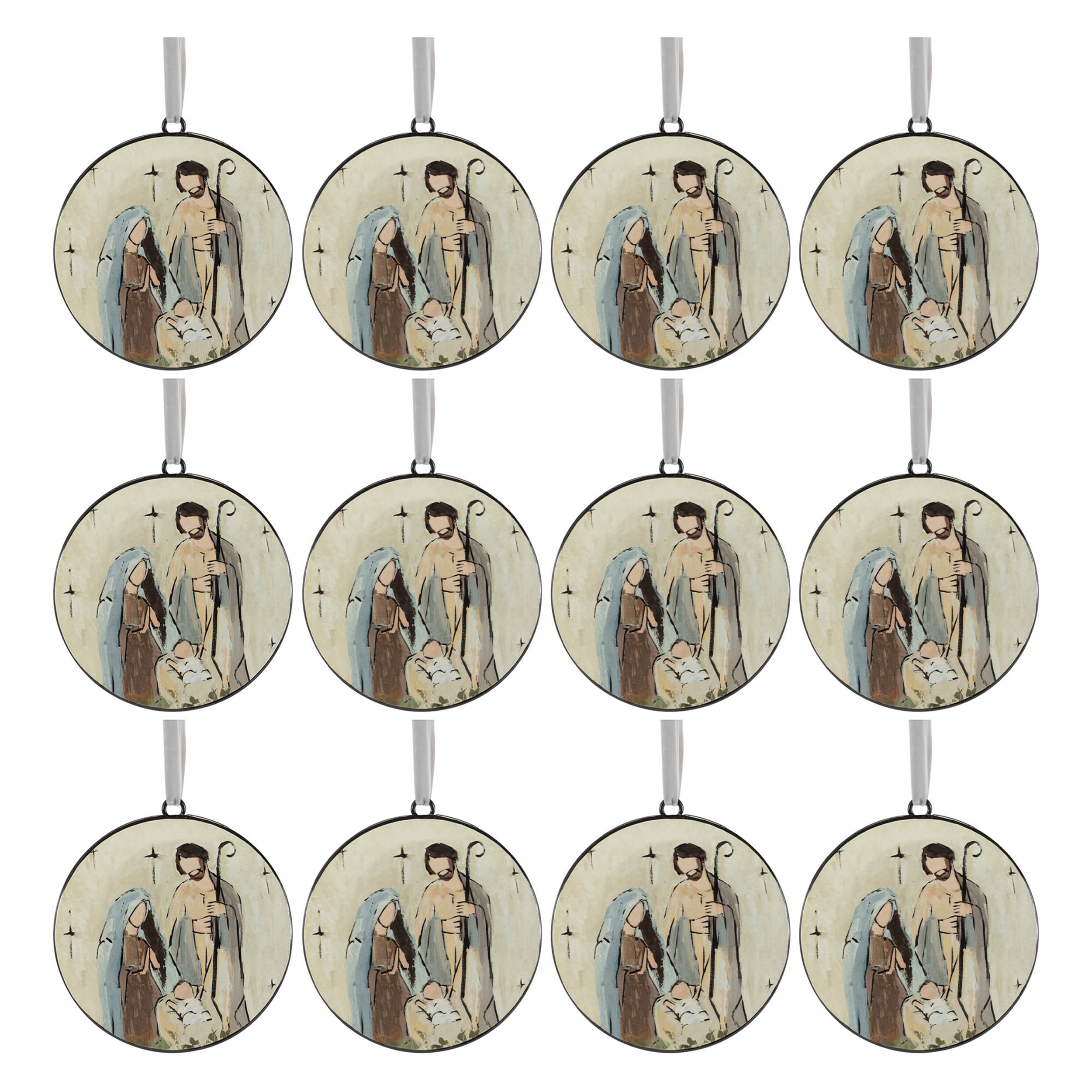 Celebrate the true meaning of Christmas with these Holy Family Disc Ornaments. Featuring a serene nativity scene with Mary, Joseph, and Baby Jesus, each ornament showcases wintry blue and beige tones, offering a peaceful and modern interpretation of the Holy Family. The delicate ribbon string hanger makes it easy to display on your Christmas tree, or to gift as a heartfelt reminder of the season. Sold in a set of 12 matching pieces, these ornaments are perfect for adding religious holiday cheer to your decor or sharing the beauty of the season with loved ones.