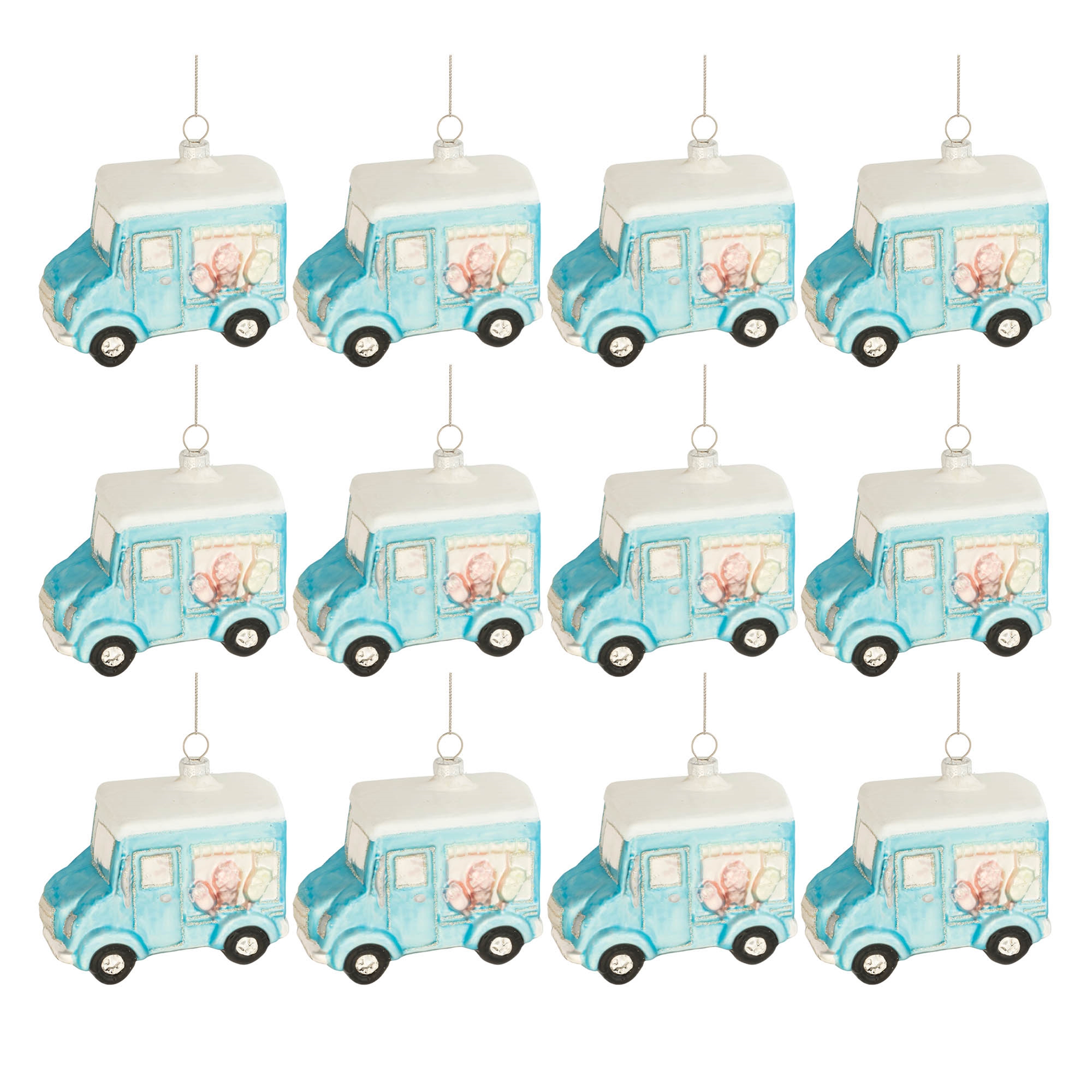 Add a sweet and whimsical touch to your holiday decor with this Glass Ice Cream Truck Ornament Set. Featuring a charming ice cream truck design in wintry blue and white tones, each ornament is adorned with glittered accents and playful popsicle and ice cream cone details. The delicate string hanger and silver ornament cap make it easy to display these delightful ornaments on your Christmas tree. Sold in a set of twelve matching pieces, these fun and festive ornaments are perfect for spreading holiday cheer or gifting to friends and ice cream enthusiasts alike.