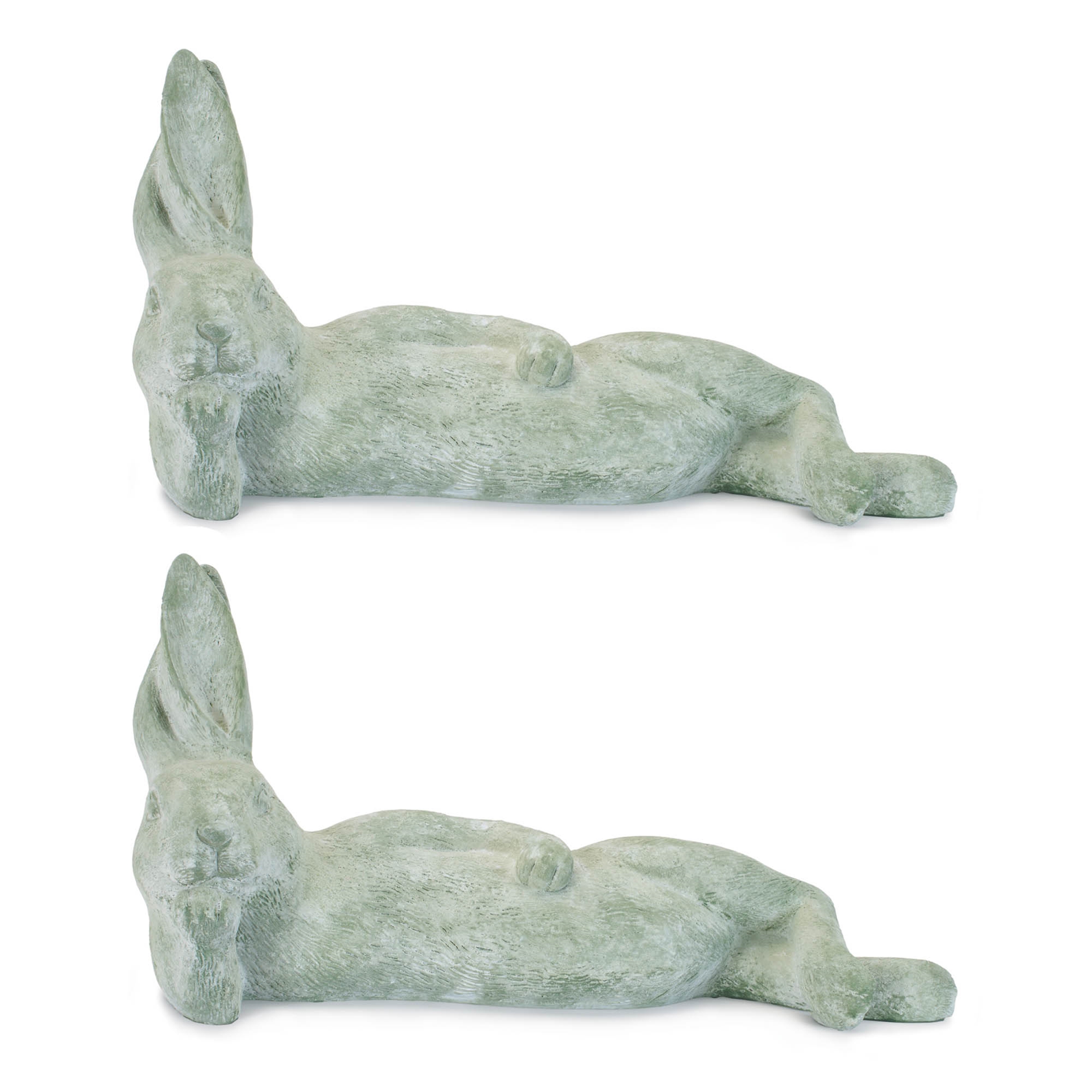 Bring a relaxed, nature-inspired vibe to your home with this set of two Laying Rabbit Figurines. Crafted from polyresin in earthy green and grey tones, each long-eared bunny features a whimsical, lounged pose with a gently distressed finish. Perfect for shelves, mantels, or tabletop displays, these charming figurines add a cozy, woodland feel to rustic, cottage, or eclectic decor styles.