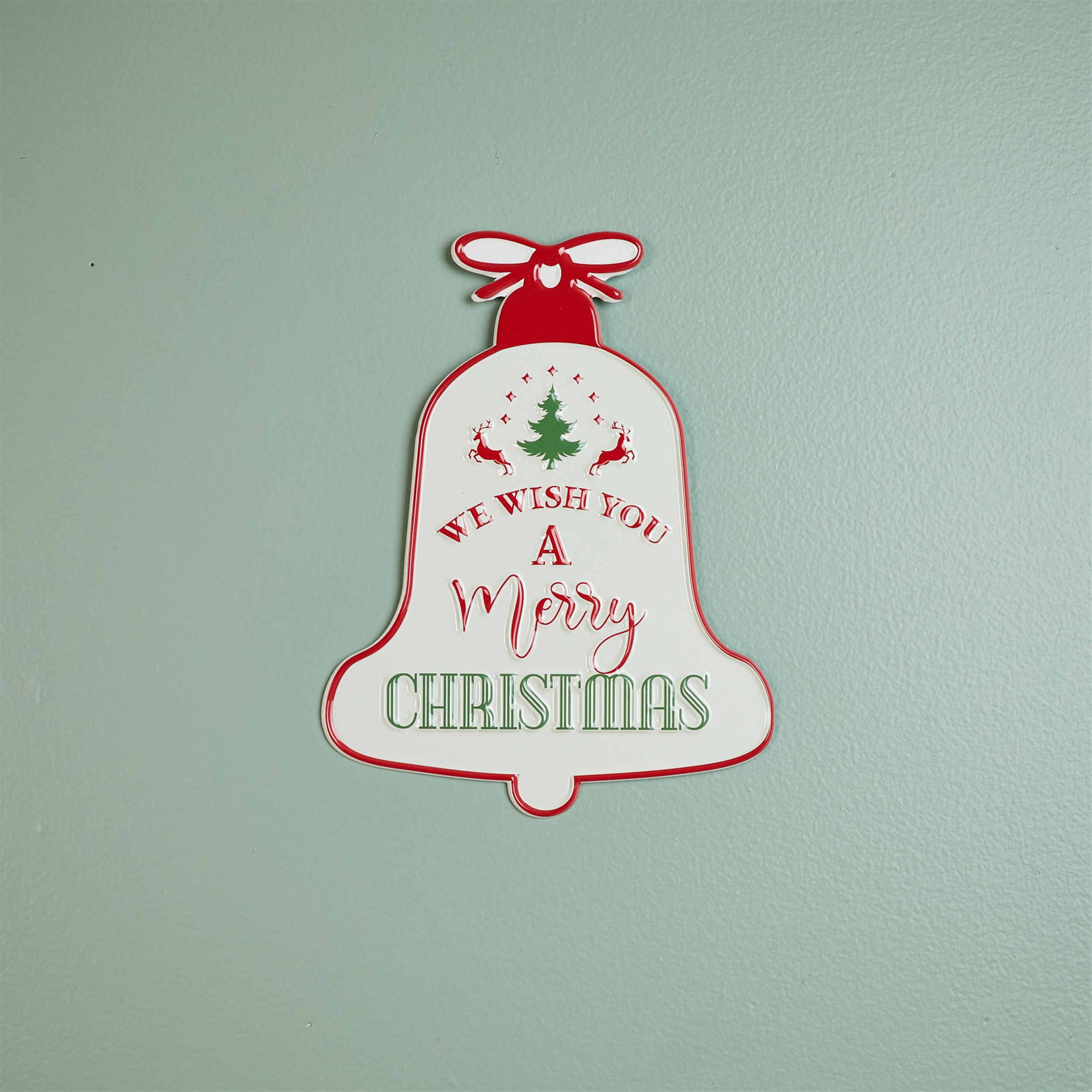 Celebrate the season with this Metal Merry Christmas Bell Sign, featuring a traditional bell shape and festive red and green tones. The sign displays the beloved sentiment “We Wish You a Merry Christmas” along with charming pine tree and deer accents. The piece comes with a sawtooth hook on the back for securing it safely to the wall of your home. This sign is perfect for adding a touch of holiday cheer to your living room or entryway, or it makes a thoughtful gift for friends and family.