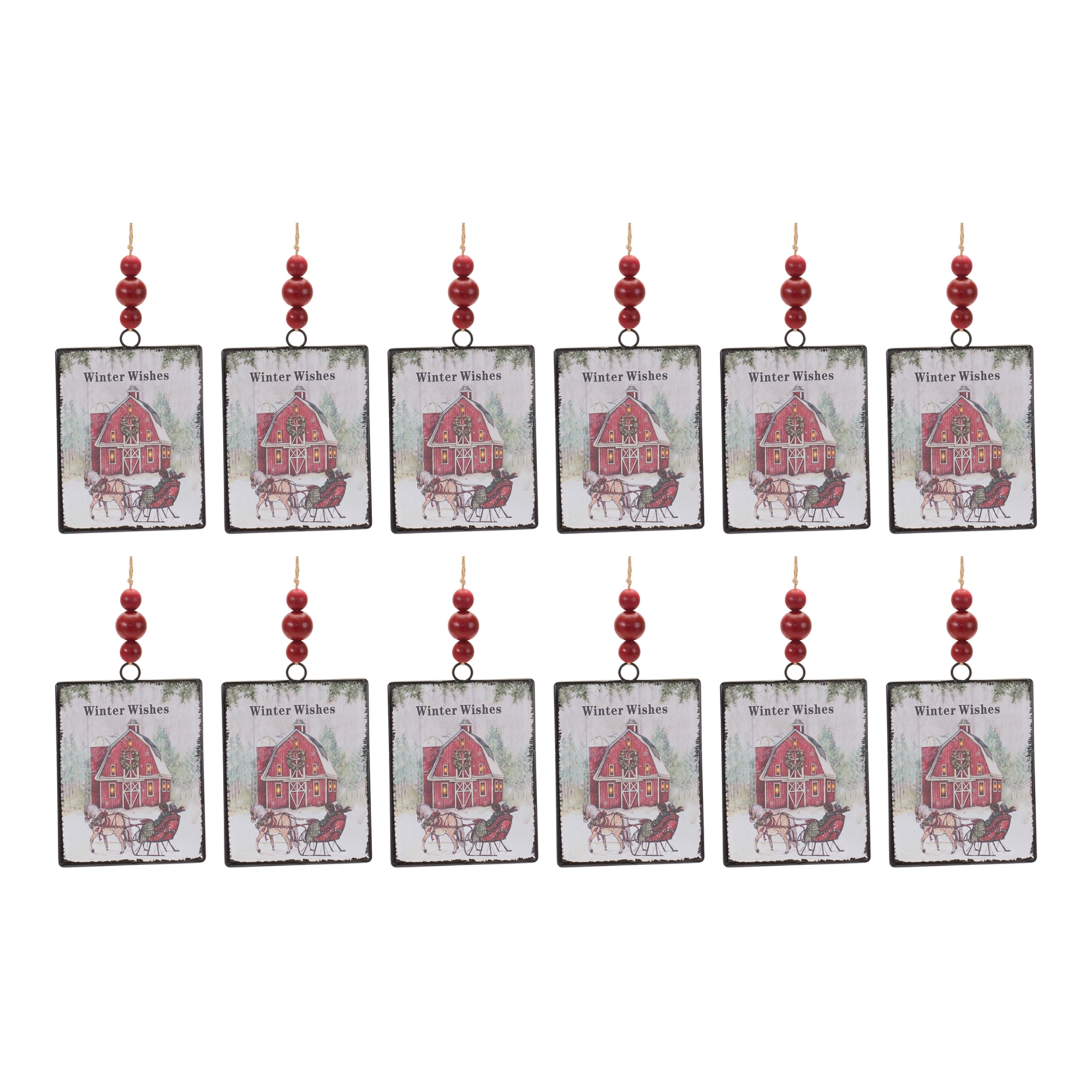 Bring a charming rustic touch to your Christmas tree with the Glass Winter Wishes Barn Ornament Set. This collection of ornaments features a beautiful barn and horse carriage couple design, accented with vibrant red and green colors, and unique wood bead details. Crafted from high-quality glass with a delicate jute string hanger, these festive ornaments are made to last for seasons to come. Perfect for creating a cozy, heartwarming display, or as a thoughtful gift to brighten up someone’s holiday season. These Winter Wishes ornaments will add a nostalgic and joyful atmosphere to your home. Sold in a set of twelve matching pieces to create a balanced display on your Christmas tree.