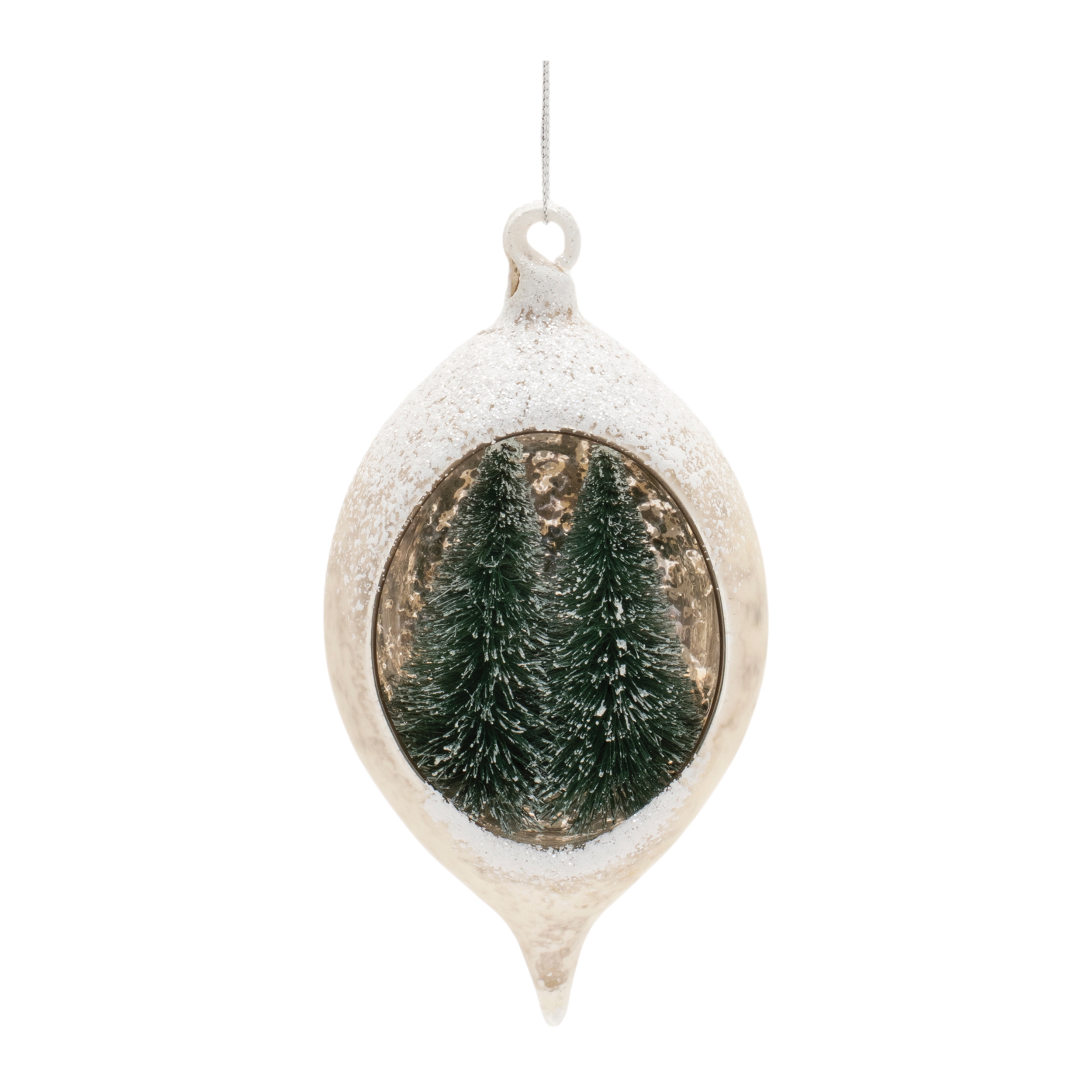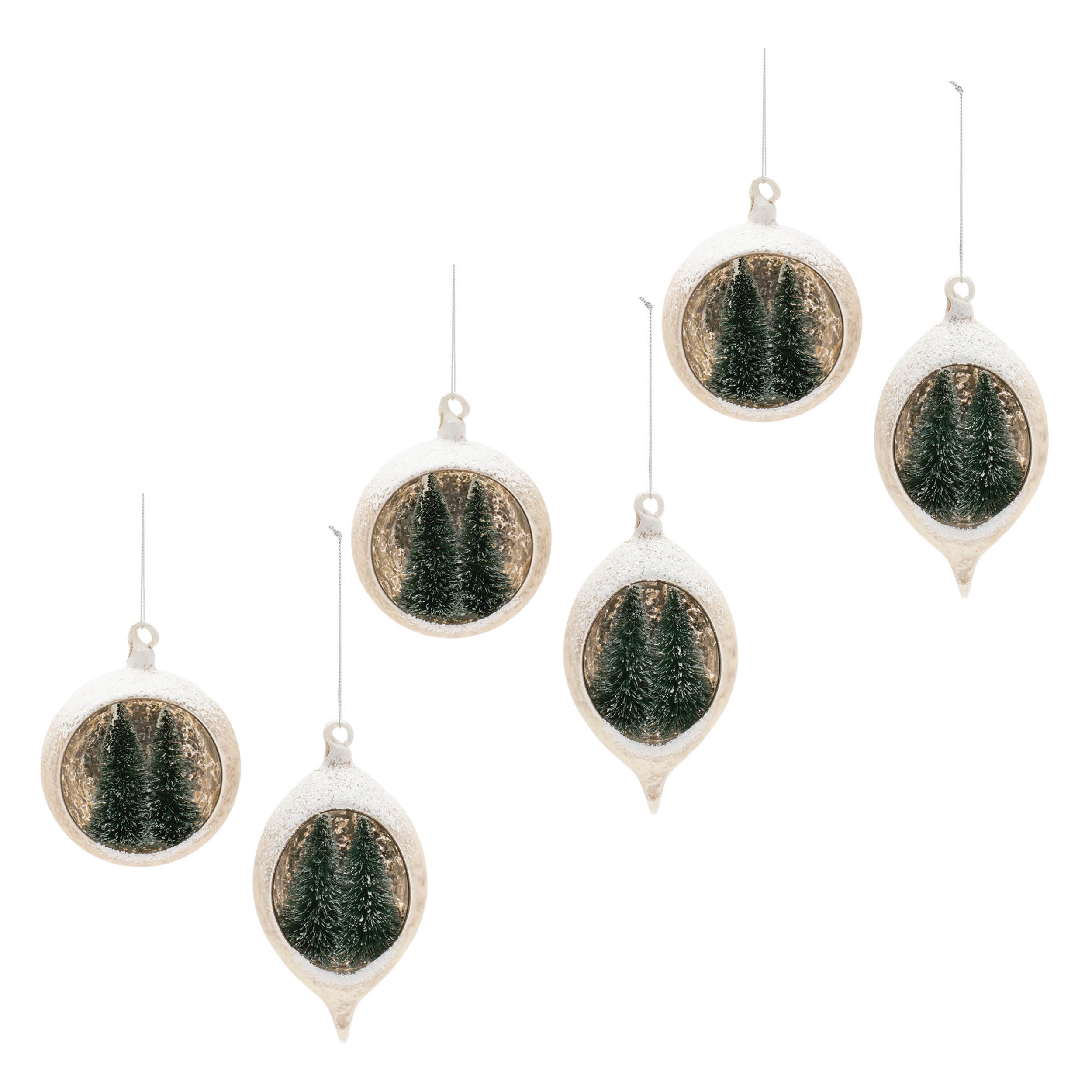 Add a magical winter touch to your holiday decor with these Mercury Glass Ornaments featuring pine tree accents. In wintry white and champagne tones with snowy touches, these traditional ball and oblong shapes are adorned with reflective surfaces and bottle brush pine trees. The elegant swirled glass ornament cap adds a sophisticated finish. Sold in a set of 6 with two assorted designs, these ornaments are perfect for hanging on your Christmas tree, wreath, or garland to enhance your woodland-themed display.