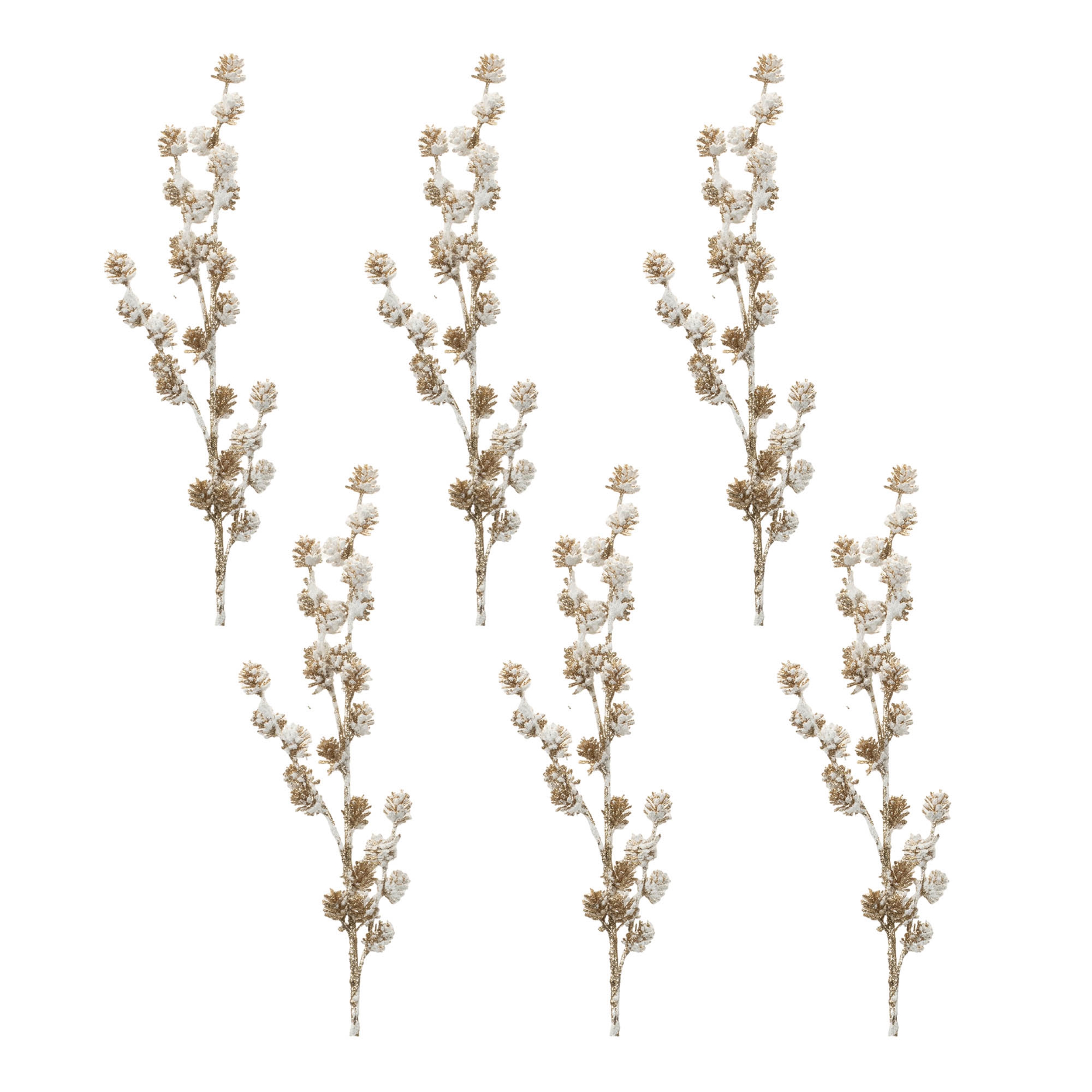 Create a winter wonderland with this Snowy Glittered Pinecone Spray set. Featuring elegant white and gold tones with chic glittered accents, these sprays showcase beautiful pinecones and a snowy flocked finish that adds a touch of frosty charm. The wired stem and flexible branches offer sturdy, customizable styling, making them ideal for holiday wreaths, garlands, floral centerpieces, or festive porch pots. Sold as a set of six, these sprays infuse your home with a glittering, wintry elegance for the season.