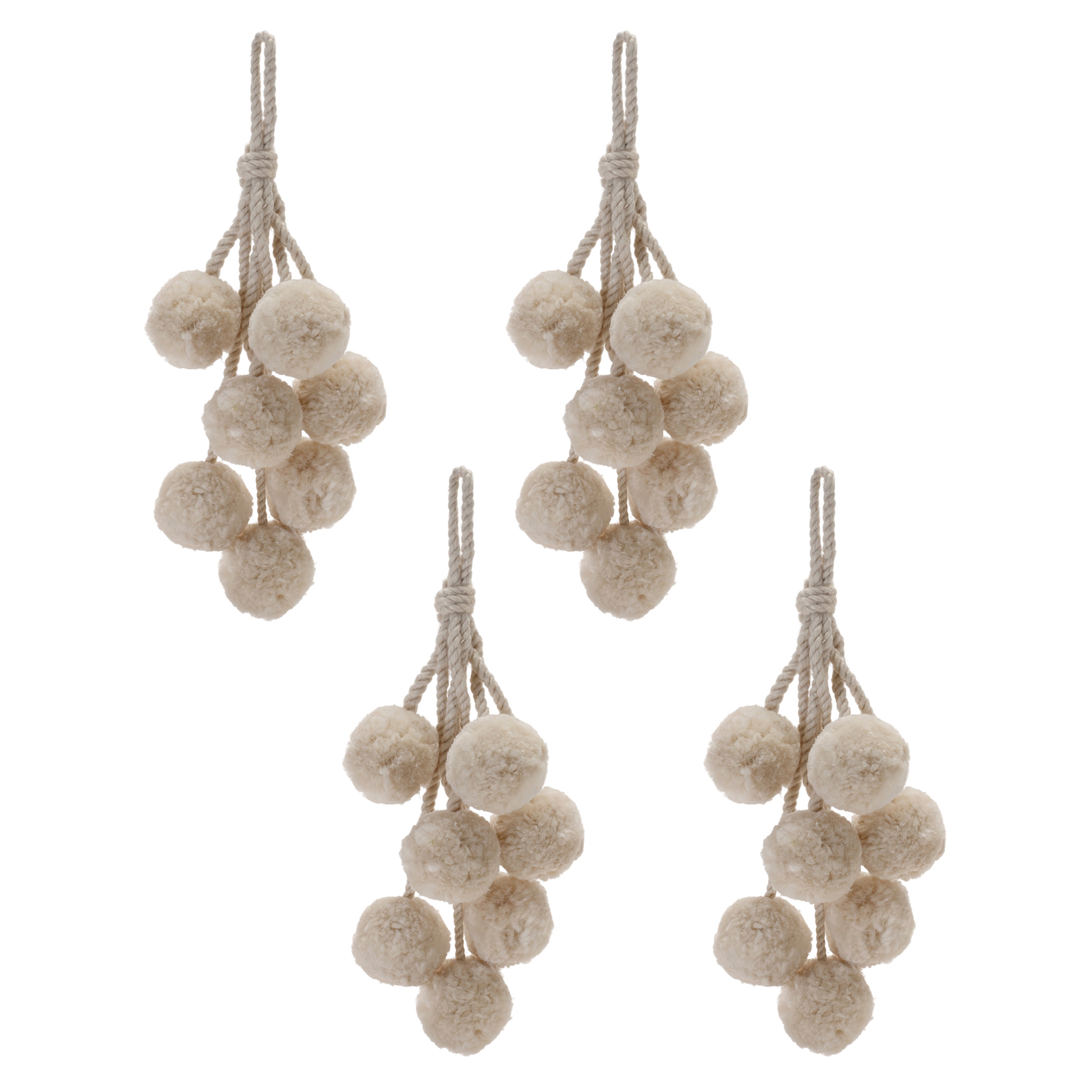 Elevate your holiday decor with the Beige Pom Pom Cluster Drop Ornament Set. This set of 14.5-inch ornaments brings a modern and stylish touch to your Christmas tree. The trendy beige color and fluffy pom pom design create a memorable display, adding warmth and charm to your home. Crafted from durable polyester with an attached rope hanger, these ornaments are made to last through many seasons of festive celebrations. Perfect for your tree, wreaths, or as a thoughtful gift, these pom pom ornaments will bring a cheerful holiday spirit wherever they are placed. Sold in a set of four matching pieces to create a balanced display on your Christmas tree.