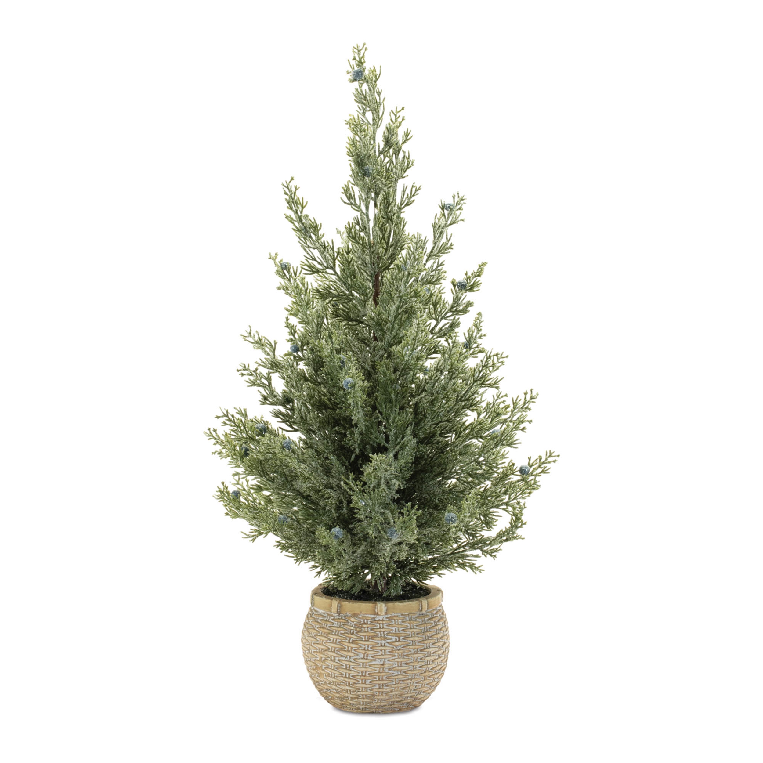 Bring the timeless beauty of nature to your holiday decor with this set of two Potted Mini Pine Trees. Designed with earthy green and brown tones, these traditional pine trees are accented with natural pinecones for an authentic woodland look. Each tree is housed in a trendy wicker-style planter, adding a warm, rustic charm to any setting. The wired branches allow for easy shaping, making these trees perfect for entryways, mantels, shelves, or alongside festive figurines for a cozy holiday display.