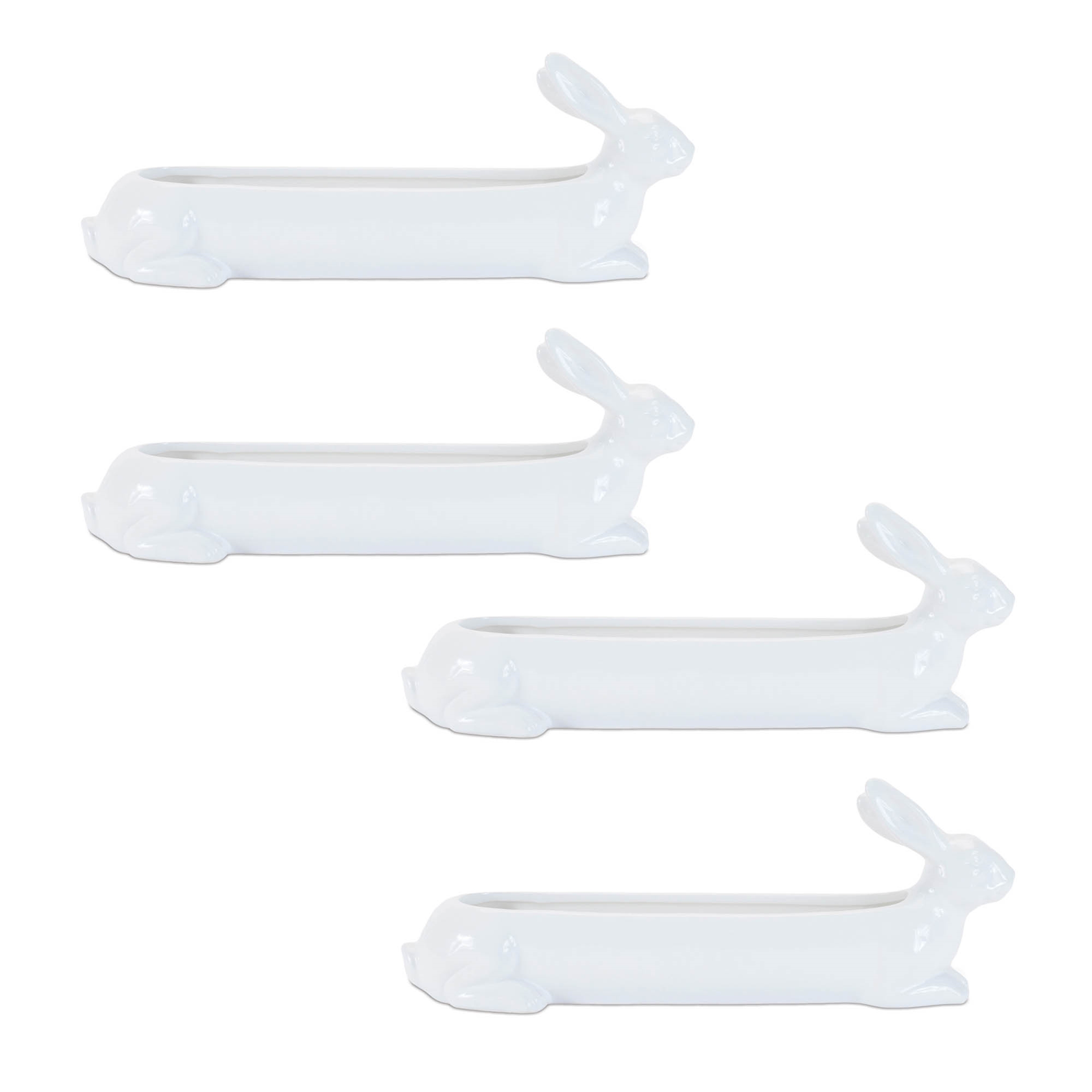Bring a playful, seasonal charm to your garden or home with this Ceramic Garden Bunny Planter set. Featuring adorable bunny characters with long bodies and built-in planters, these planters are finished in cool white tones with a shiny glazed finish. Sold as a set of four matching pieces, they’re perfect for displaying on your garden, patio, or as centerpieces with fresh spring or Easter floral arrangements, adding a delightful touch to any space.