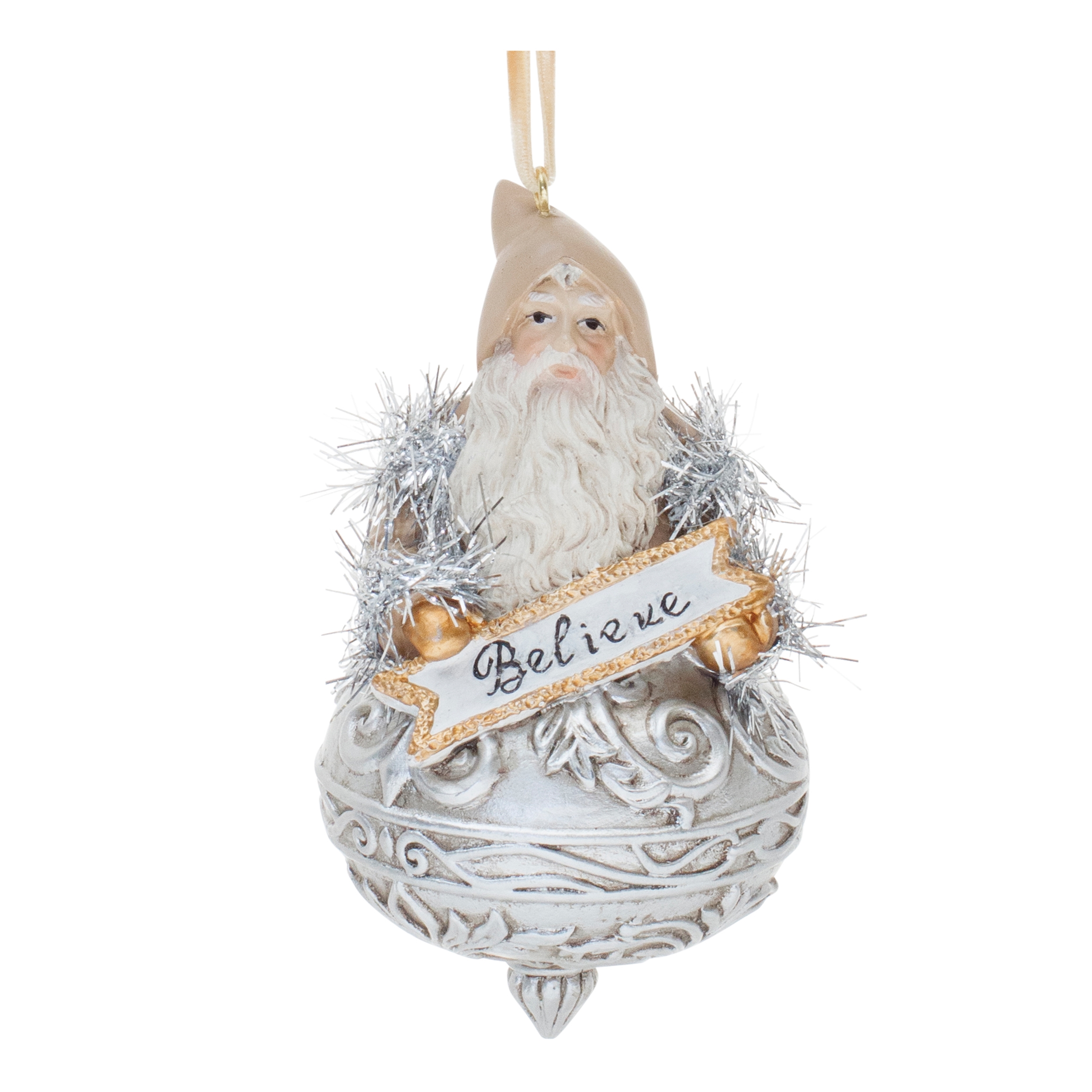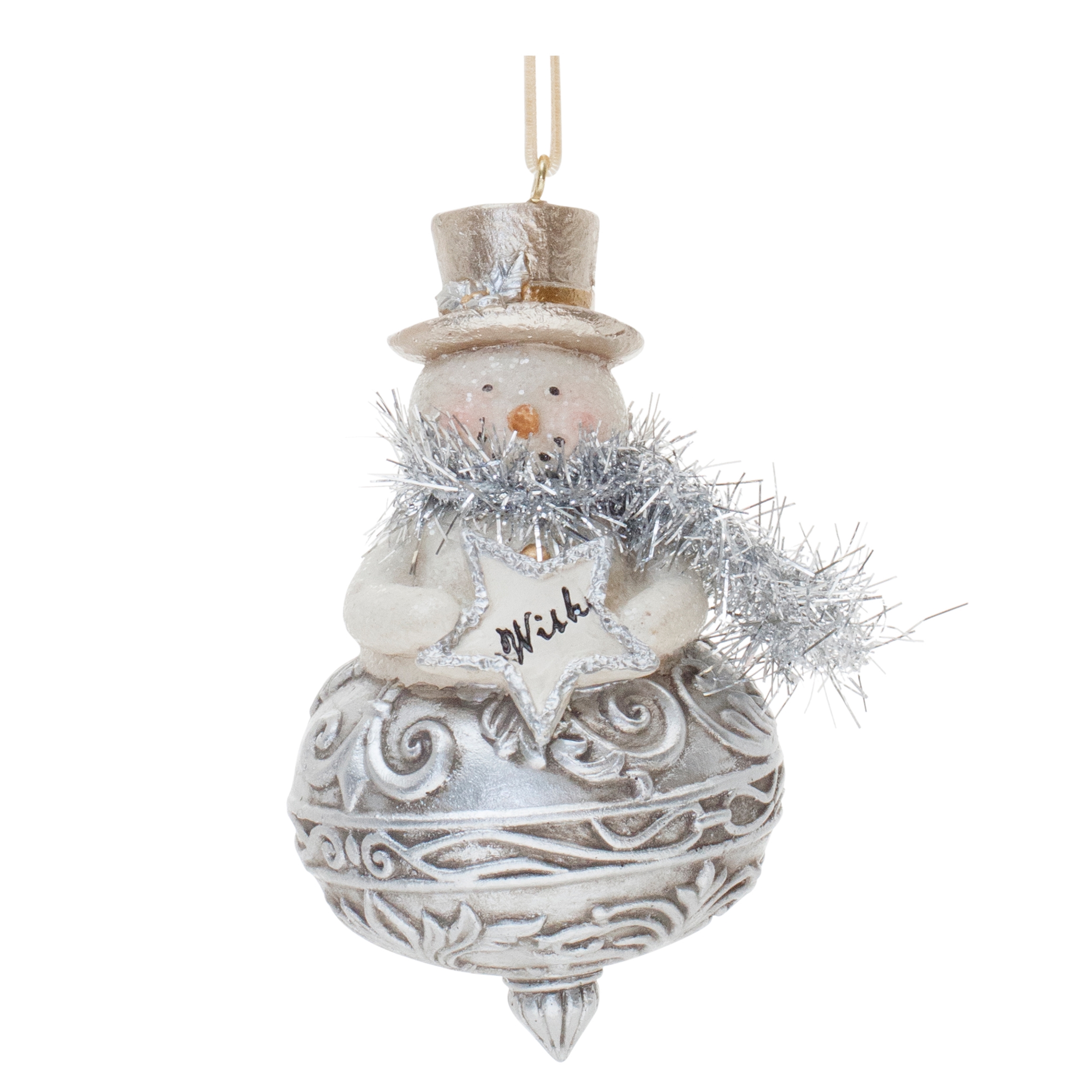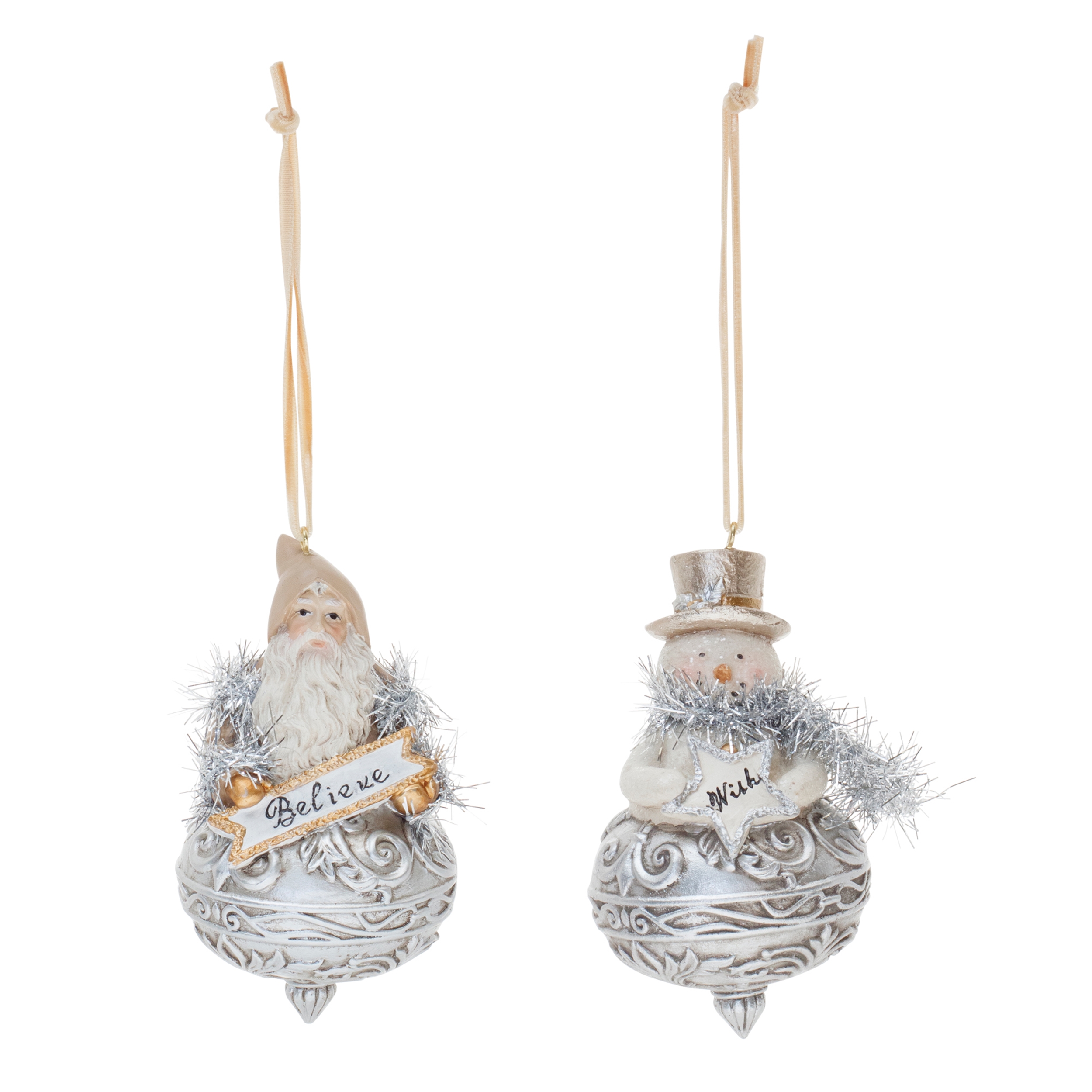 Add a touch of festive charm to your holiday decor with this exquisite set of Santa and Snowman Finial Ornaments. Featuring beautifully detailed ornaments in shimmering silver and gold tones, these whimsical designs showcase joyful Santa and snowman figures with uplifting “Believe” and “Wish” accents. Crafted from durable polyresin and stone powder, these ornaments are built to last for seasons to come. Whether adorning your Christmas tree or gifted to a loved one, these ornaments bring warmth, joy, and holiday spirit to any space. Sold in a set of six pieces with two assorted designs to create a balanced display on your Christmas tree.