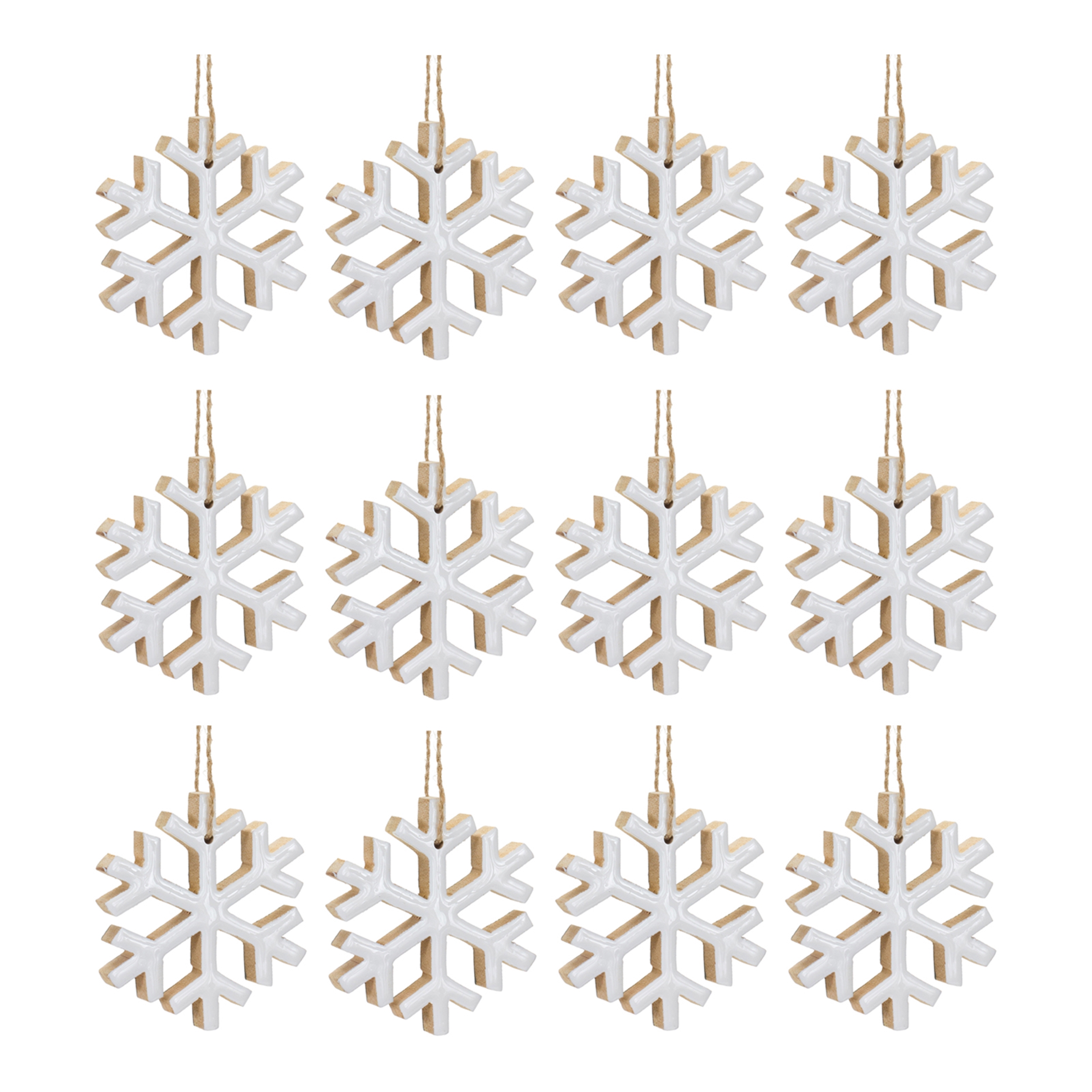 Add a magical touch to your holiday decor with our Snowflake Ornament Set! Crafted from durable MDF wood and featuring a charming white finish, these ornaments bring the beauty of a winter wonderland into your home. Whether you’re decorating your Christmas tree or giving a thoughtful gift, this set of twelve snowflakes with jute hangers will shine brightly and add a cozy, festive vibe to any space. Perfect for indoor use, they’re the ideal addition to your seasonal celebrations. Sold in a set of twelve matching pieces to create a balanced display on your Christmas Tree.