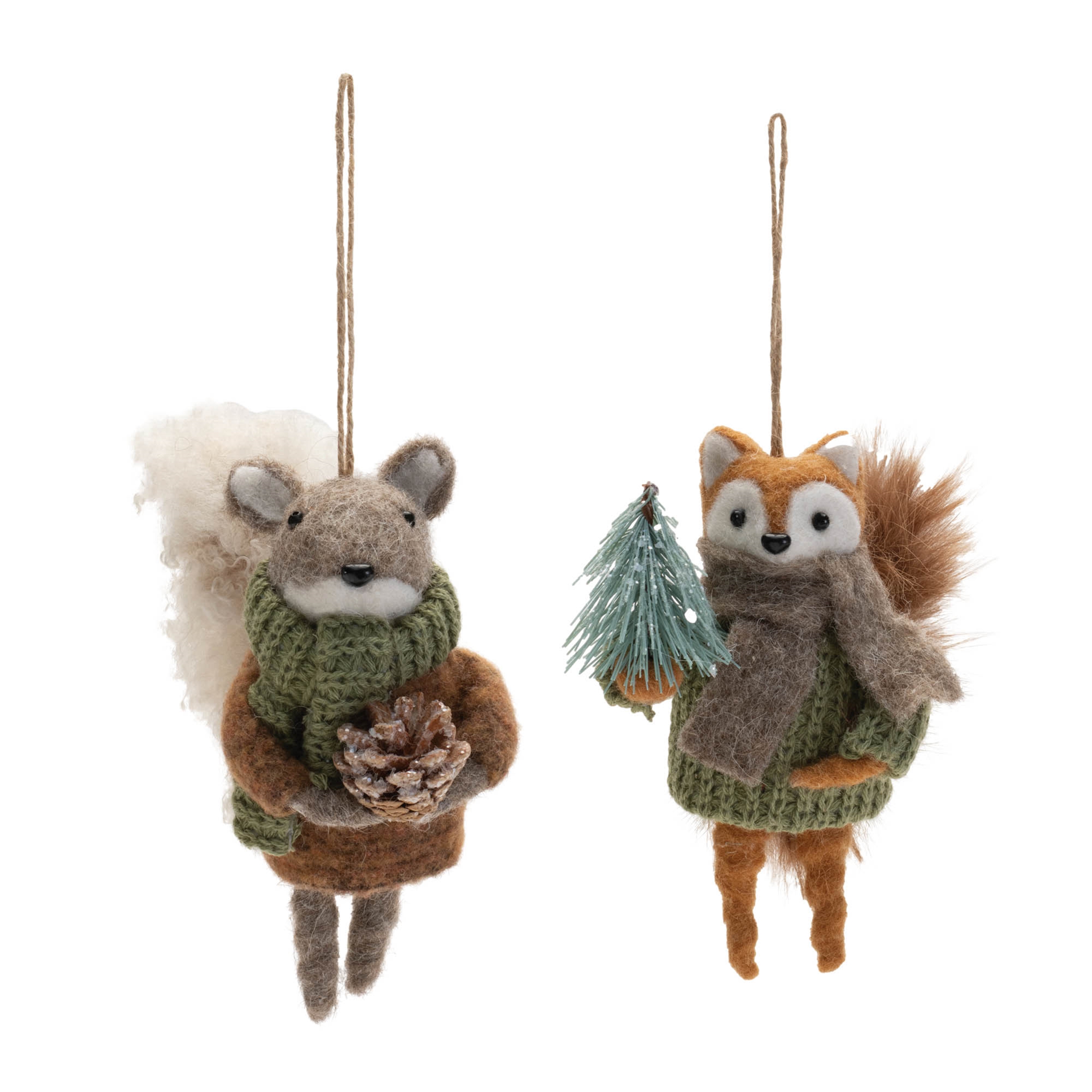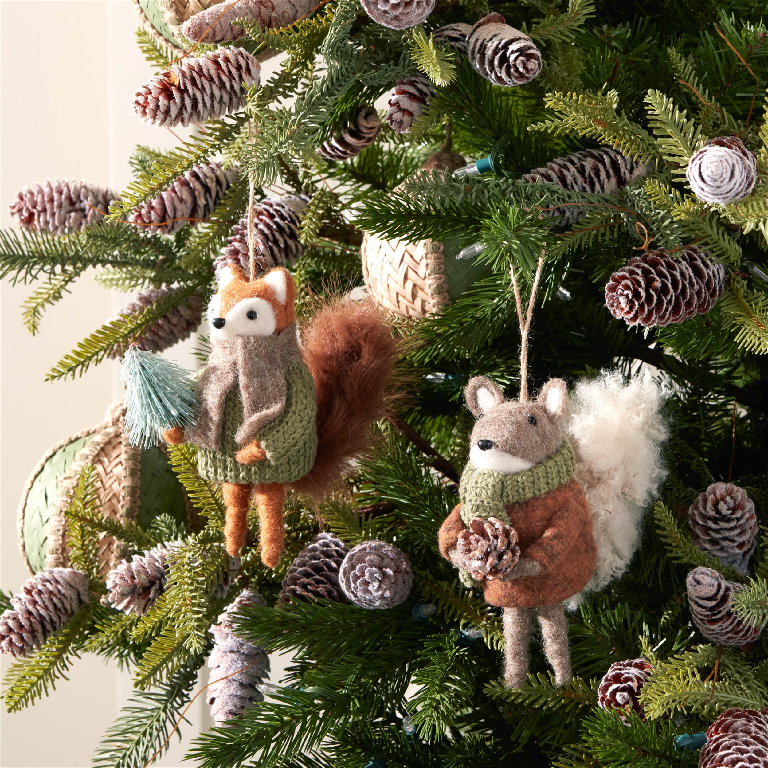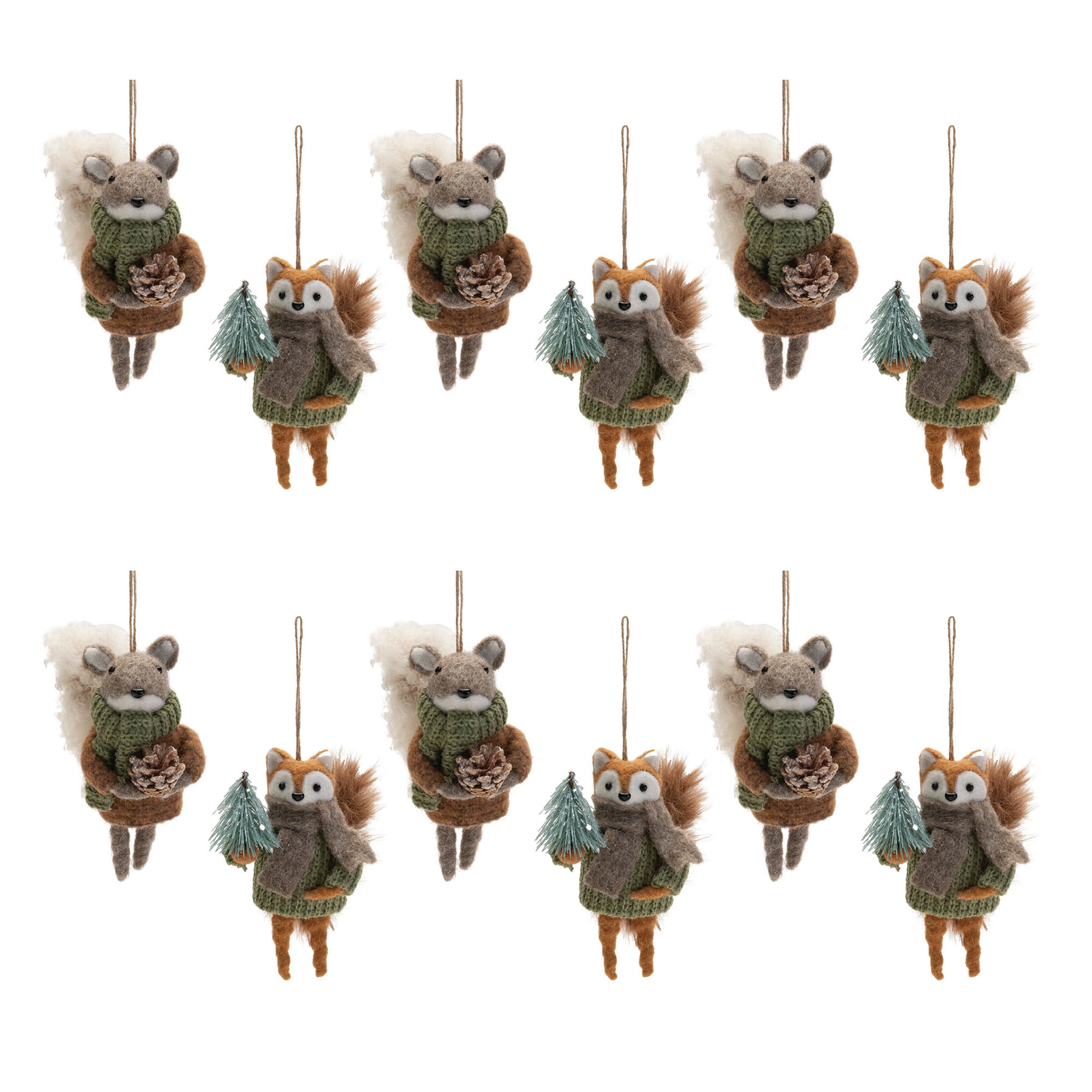 Add a cozy, woodland touch to your holiday decor with this set of Felt Squirrel and Fox Ornaments. Designed in wintry green and brown tones with glittered accents, these adorable characters are dressed in cozy sweaters and scarves and accented with pinetree and pinecone details. The jute string hanger enhances the rustic charm, making these ornaments a perfect fit for a woodland-themed Christmas tree, wreath, or garland. Whether placed on your tree or woven into your seasonal displays, this set of 12 cute ornaments bring a warm, rustic holiday cheer to your home.