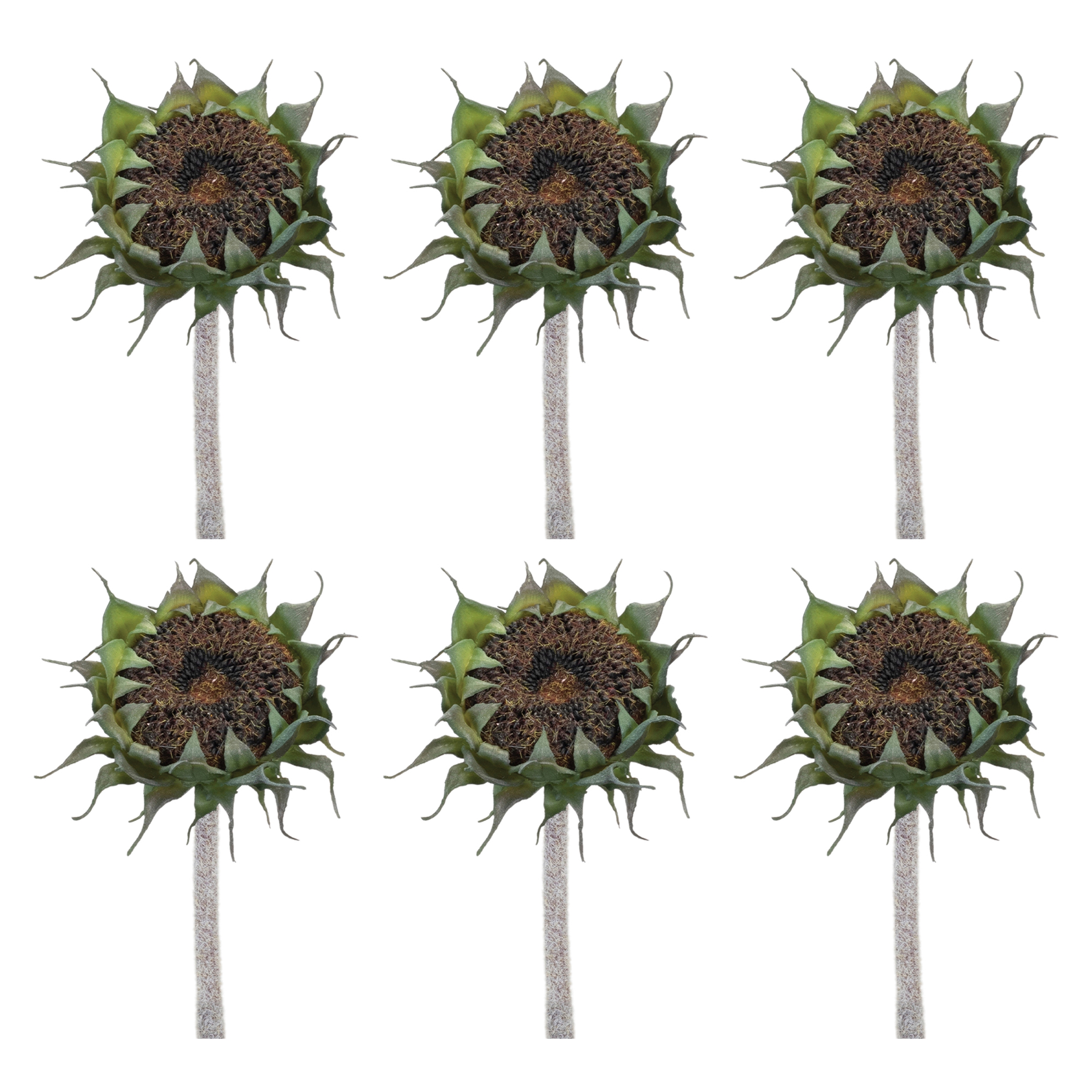 Bring the beauty of nature indoors with this stunning set of Brown Sunflower Stems. Featuring rich earthy tones of green and brown, these faux stems offer a realistic and timeless touch to any floral arrangement. Crafted from high-quality polyester, plastic, and wire, they provide lasting elegance without maintenance. Perfect for vases, centerpieces, or wall baskets, these versatile stems elevate your home decor effortlessly. Sold in a set of six matching pieces to make a statement in your floral vases or arrangements.