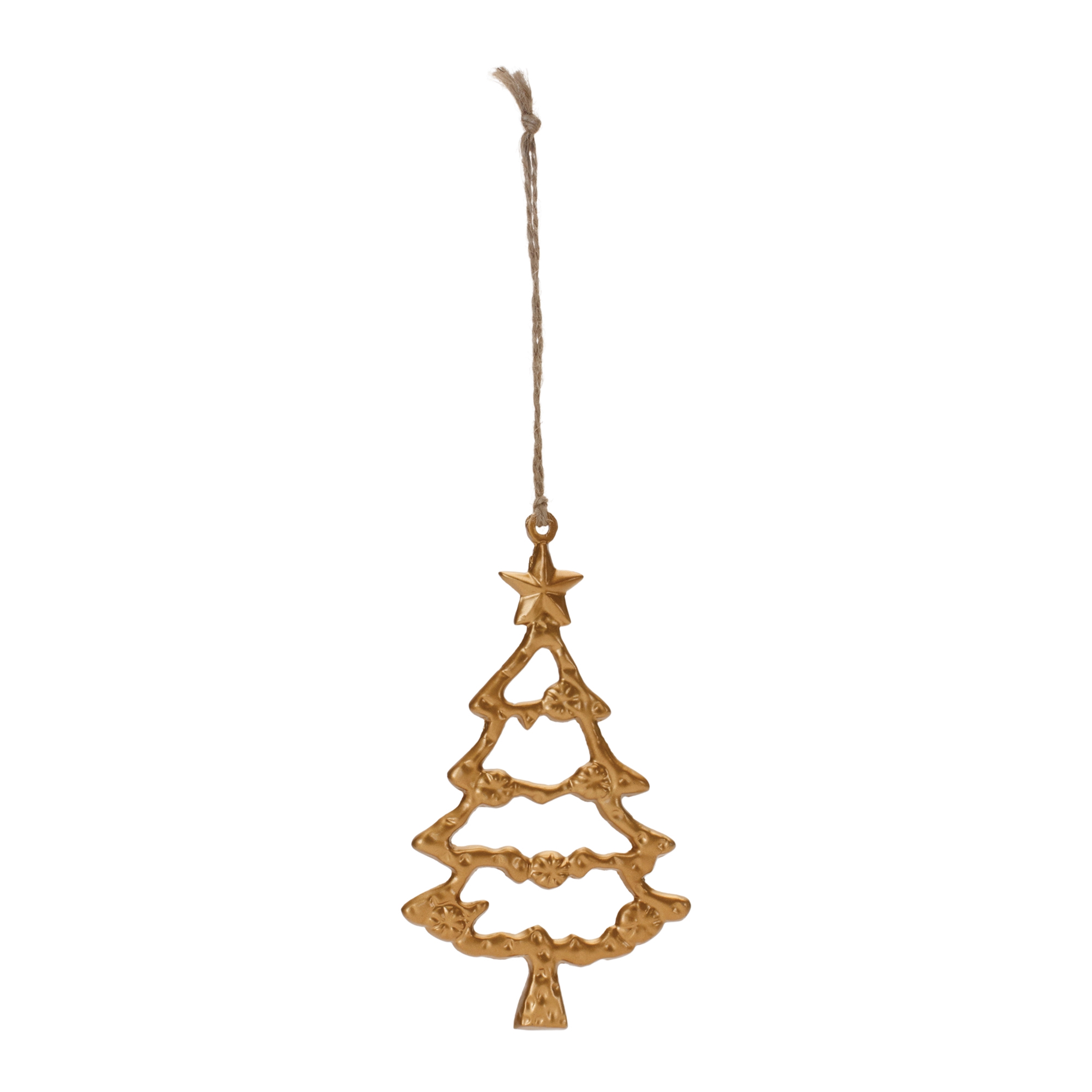 Add a festive touch to your holiday decor with this stunning set of Gold Metal Tree Ornaments. This collection includes beautifully crafted ornaments, each designed with two unique tree outline patterns, all in a chic gold finish. Made from durable aluminum, these ornaments feature a delicate jute string hanger for easy display. Perfect for indoor use, they will shine on your Christmas tree for years to come. Whether you’re decorating for the season or gifting them to loved ones, these elegant ornaments will bring timeless holiday cheer. Sold in a set of twelve matching pieces to create a balanced display on your Christmas tree.