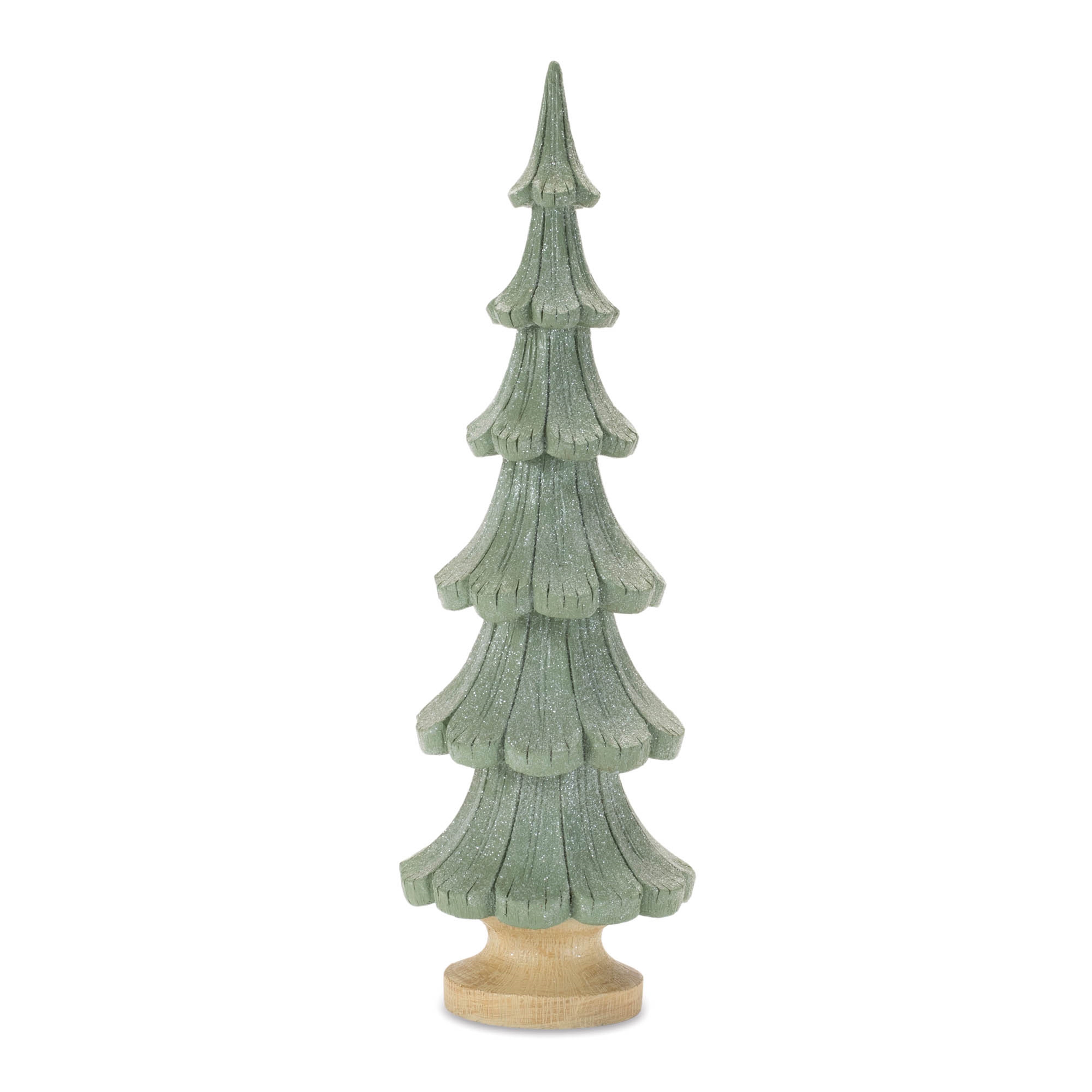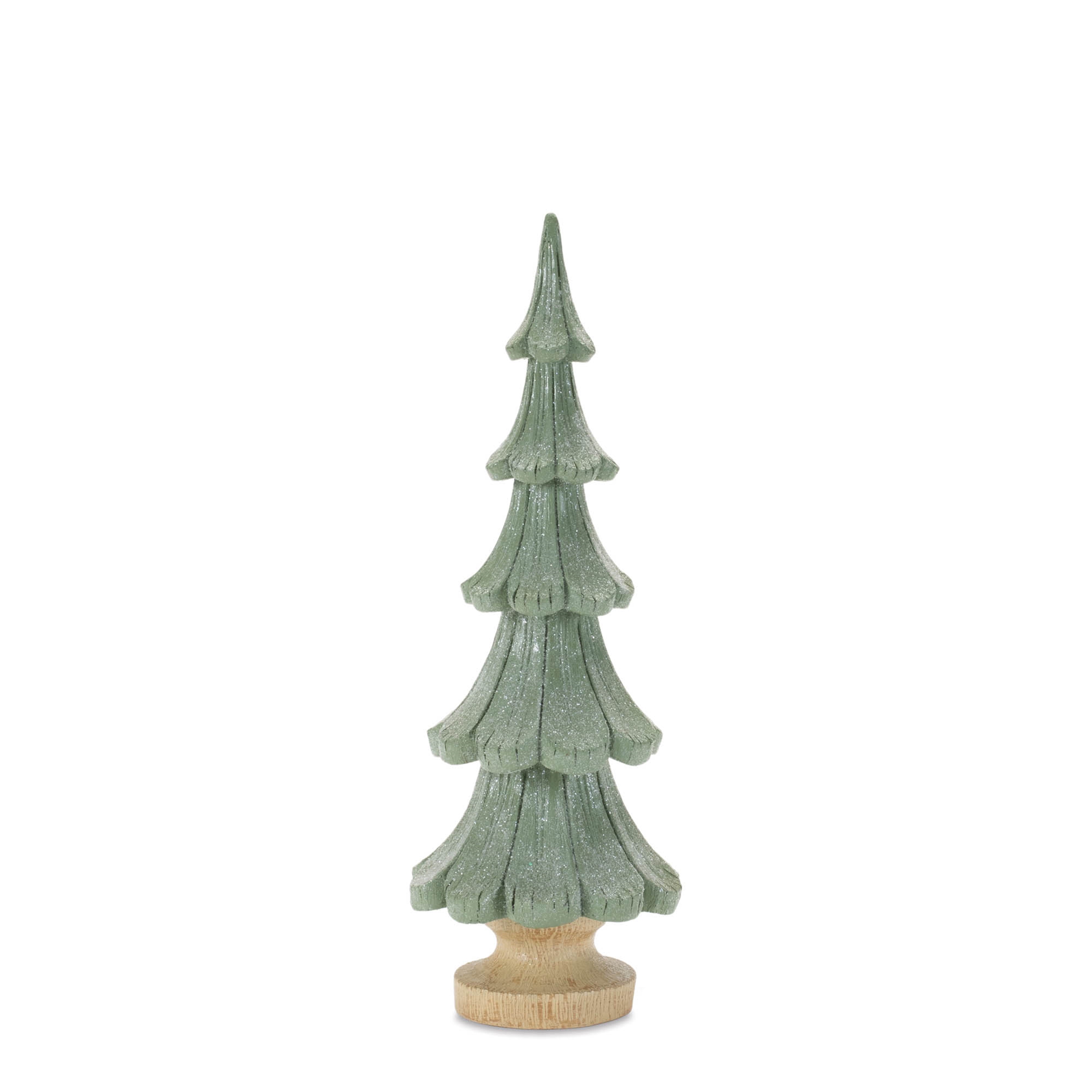Bring the beauty of winter into your home with this Glittered Pine Tree Set. Featuring earthy green tones with a sparkling glittered finish, these trees showcase rustic faux wood grain etching and modern tree shapes for a charming blend of tradition and contemporary style. The set includes three trees of varying sizes, perfect for placing on your tabletop, shelf, or mantle. Pair them with a seasonal floral arrangement, holiday deer, or Santa figurines for a stunning festive display.