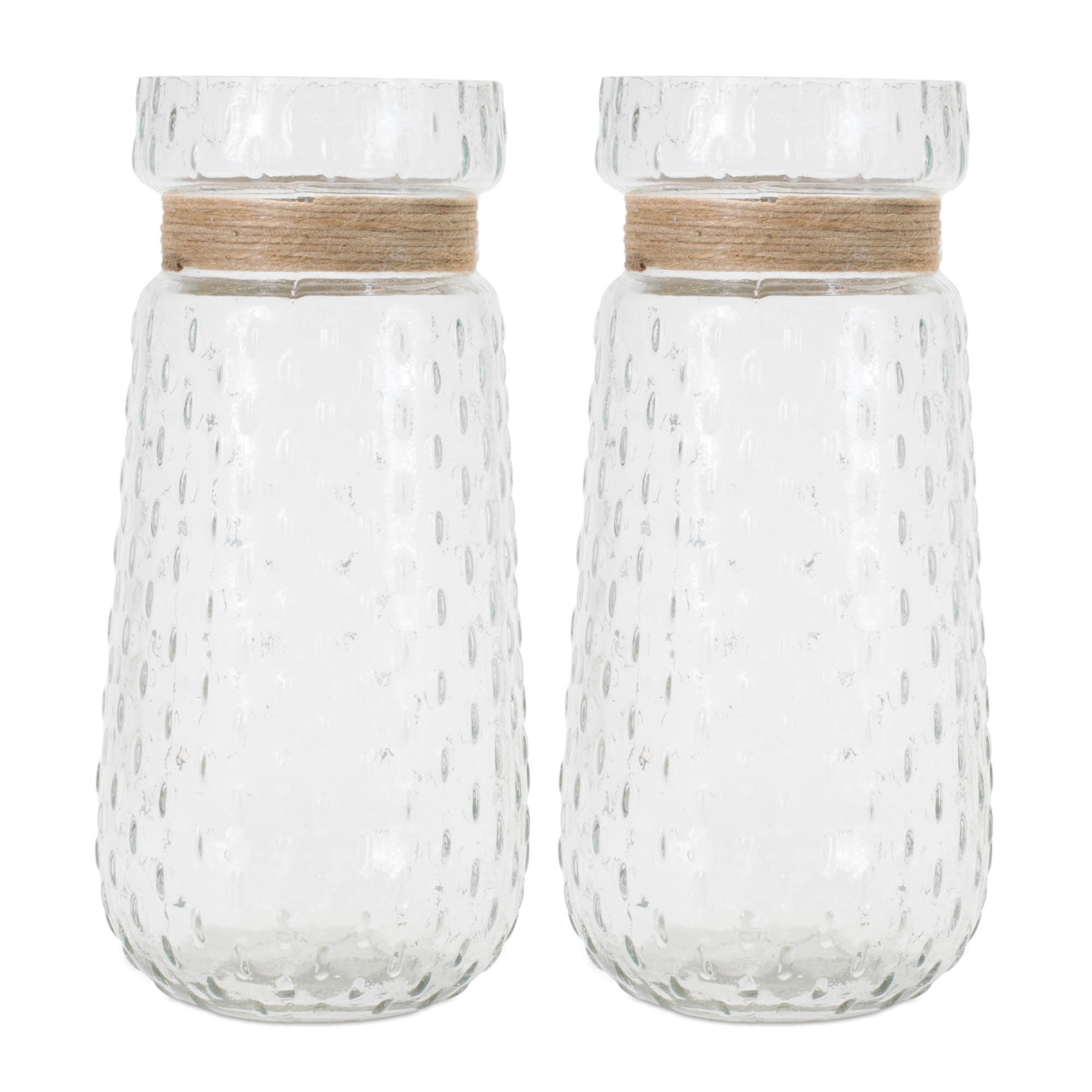 Bring a coastal charm to your home with this set of two textured glass vases. Featuring a chic clear glass finish with a rustic jute rope accent, these vases have a modern shape with a wide opening. The textured design adds visual interest, making them perfect for displaying on your bookshelf, mantle, coffee table, or end table. Fill them with fresh garden stems or greenery to add a touch of nature to your home. Sold as a set of two matching pieces, these vases are an ideal fit for nautical or coastal style decor, blending modern elegance with rustic charm.